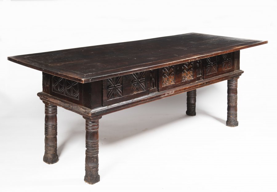 Masivní renesanční konzolový stůl patrně z oblasti Pyrenejského poloostrova s figurální (muž a žena) a stylizovanou florální řezbou se třemi zásuvkami a se stylizovanými nohami. Jedná se o velice raritní kus nábytku, který byl součástí patrně mobiliáře refektáře. Původní zachovalý stav, místy s restaurátorským zásahem.