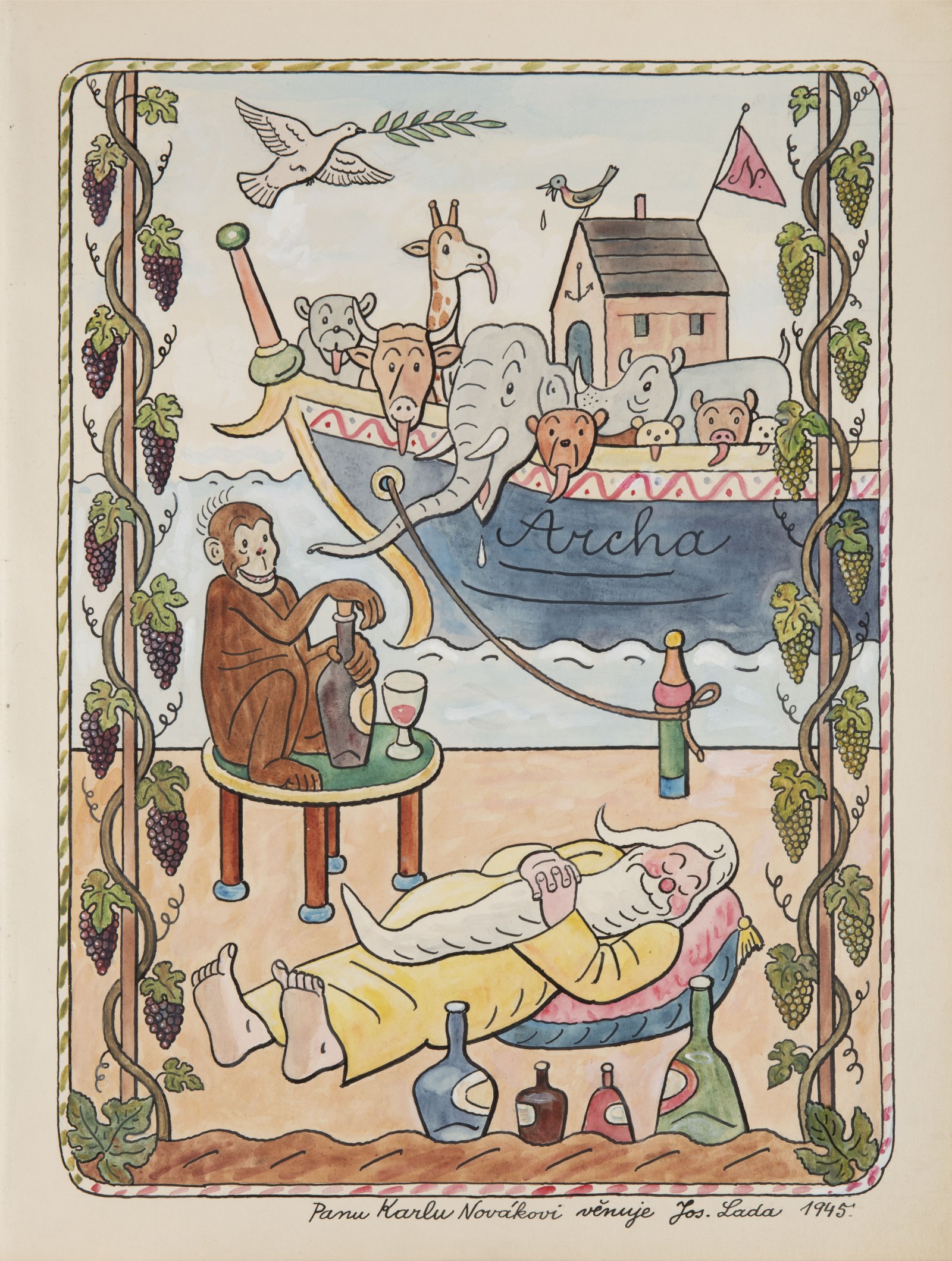 Kresba Spící Noe patří mezi unikátní díla Josefa Lada, jejichž vznik je spojen přímo s konkrétní osobou. Josef Lada ji vytvořil pro vinárníka Karla Nováka vlastnícího vinárnu poblíž Týnského chrámu, kterou s oblibou navštěvoval společně s dalšími malíři i básníky. V návštěvní knize mu zanechávali kresby v upomínku. Nejinak tomu bylo v případě Josefa Lady. Ikona českého malířství a ilustrátorství s typickým rukopisem silné linky a zaoblenými tvary postav dnes již patří k lidovému oslavování svátků a českému folklóru. Posouzeno PhDr. Pavlou Pečinkovou.