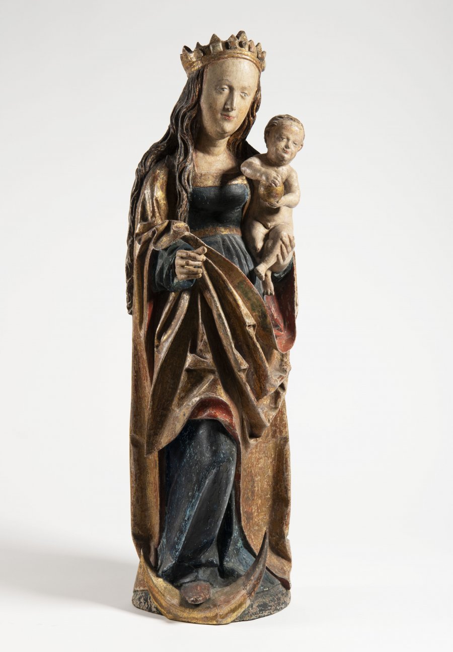 Jemně vykreslená tvář Panny Marie plná živosti a ušlechtilosti je lemována kontrastně působící detailní řezbou vlnitých vlasů. Madona stojí na půlměsíci, s Ježíškem v levé ruce. Madona má na hlavě typickou korunu, je bez roušky, oděna je do tmavě modrých šatů se zlato červenou drapérií. Ježíšek má v ruce jablko – atribut svrchované moci. Odkaz francouzské gotiky se zde projevuje v dynamické hře světla a stínu v záhybech oděvu. Plastika je ve velmi dobrém stavu, zachována je původní polychromie.
