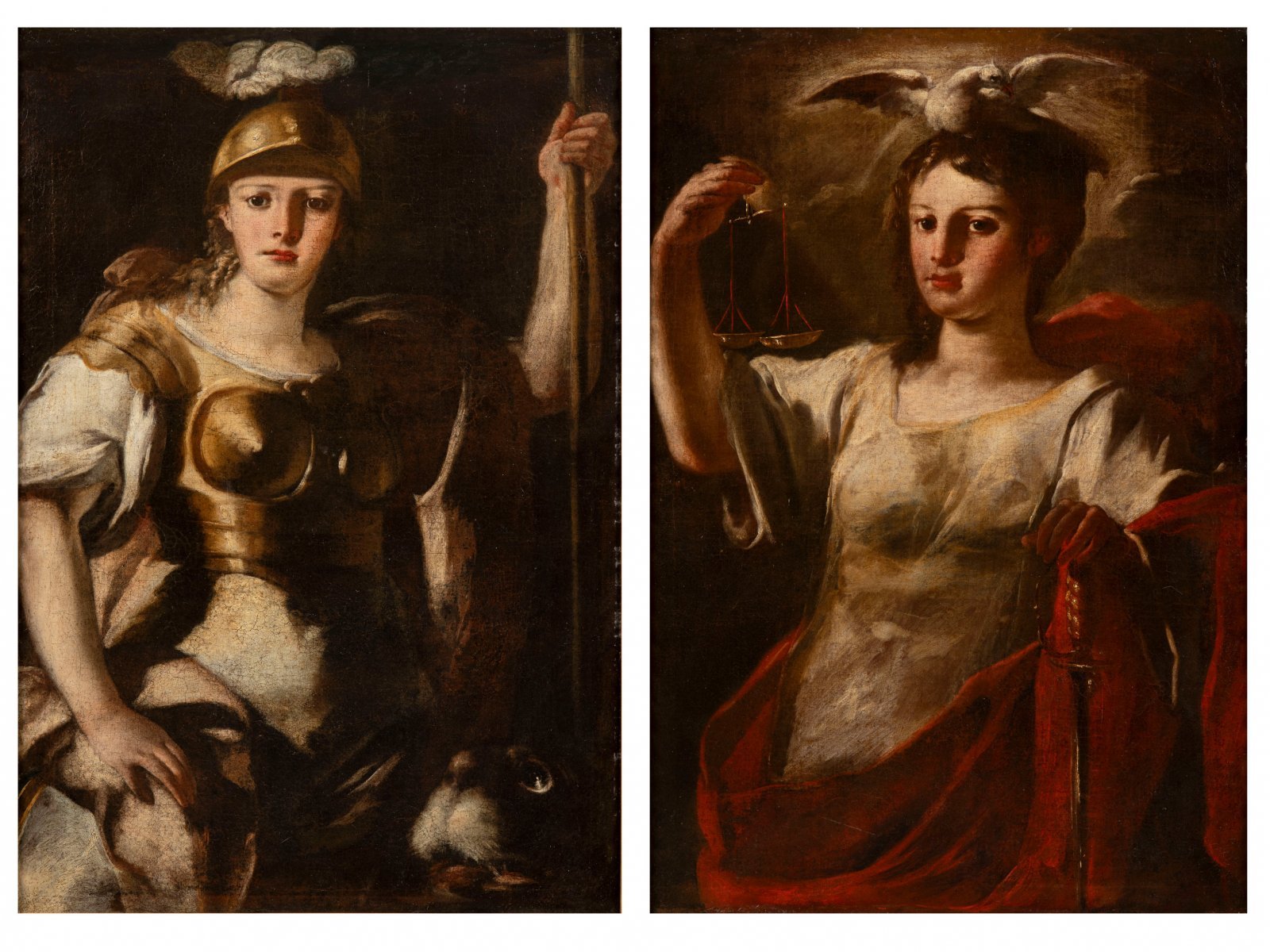 Corrado Giaquinto, považovaný za vrcholného představitele rokokového malířství v Římě v první polovině 18. století a inspirativní osobnost pro různé generace španělských malířů, byl plodným autorem nejenom v množství olejomaleb ale především fresek. Jeho nejambicióznějšími uměleckými projekty byla výzdoba Královského paláce, kde byl zodpovědný za návrhy štukatur, soch a malířských projektů. Párové alegorické obrazy, které z repertoáru Corrada Giaquinta známe, jsou reprezentativní ukázkou rokokové ikonografie a nachází se na nich náměty Pallas Athény a Spravedlnosti. Velká pozornost je zde věnována jak atributům, tak očím obou žen, které hledí vyzývavě do prostoru. Obě malby vykazují cit pro určitou dramatičnost a jejich těla, brnění a drapérie se vynořují ze stínů do měkkého světla.