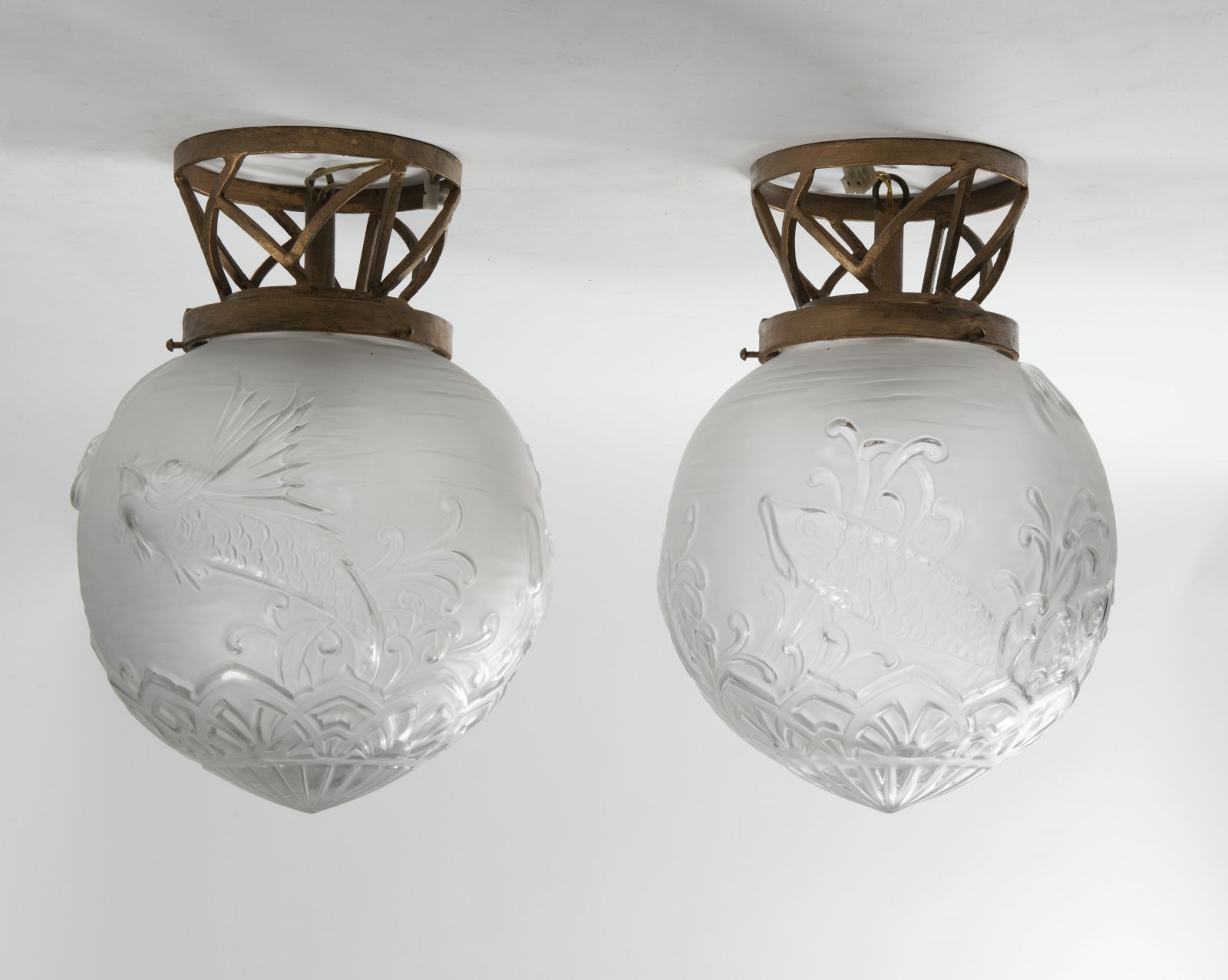 Půvabná párová osvětlení stylu art deco s motivem vodního živlu s plastickým dekorem ryb. Sklo, lisované do formy, je částečně matované a leštěné. Dle kvality zpracování a zvířecímu motivu se patrně jedná o práci firmy Sabino France. Montáž je z kovaného železa ze zlatou patinou.