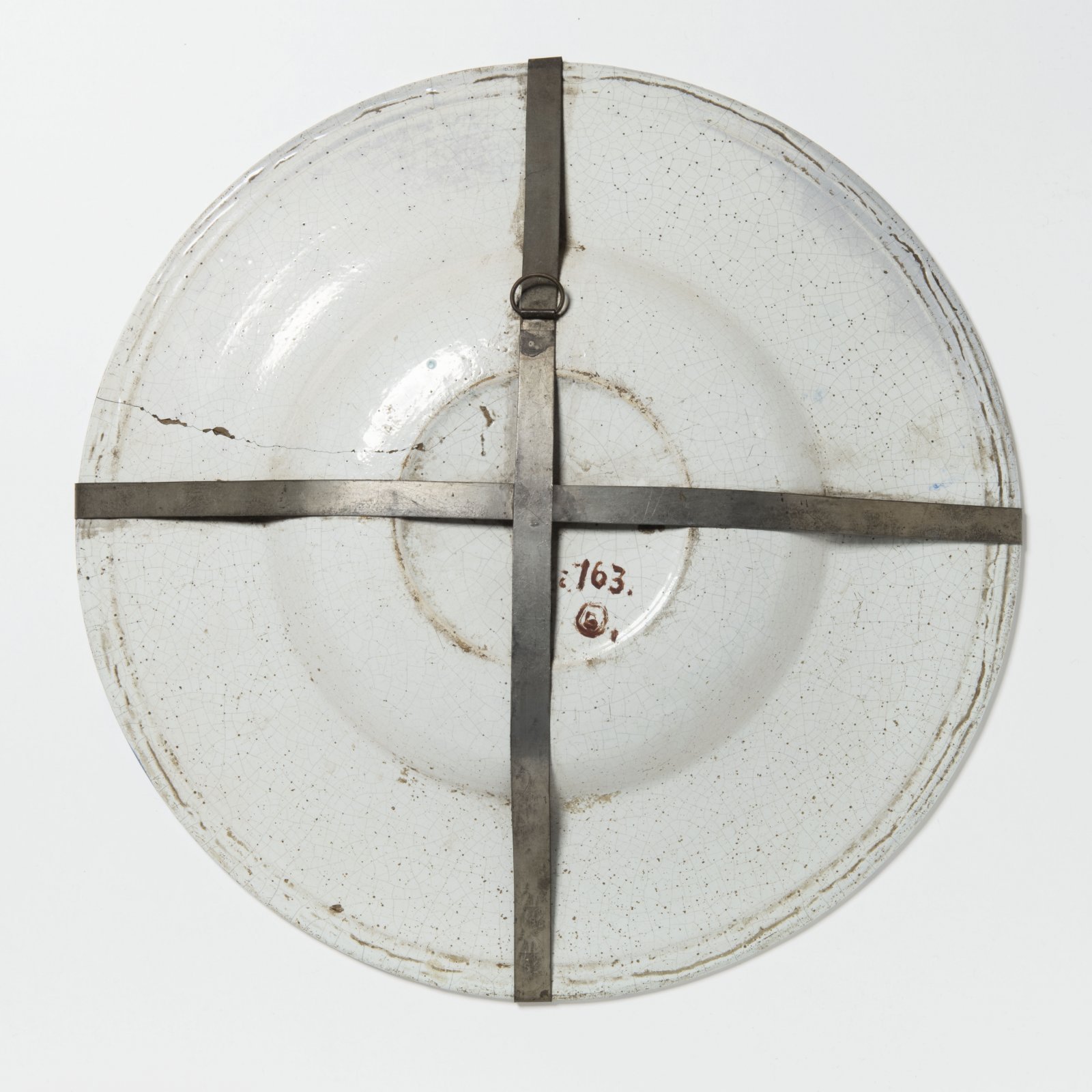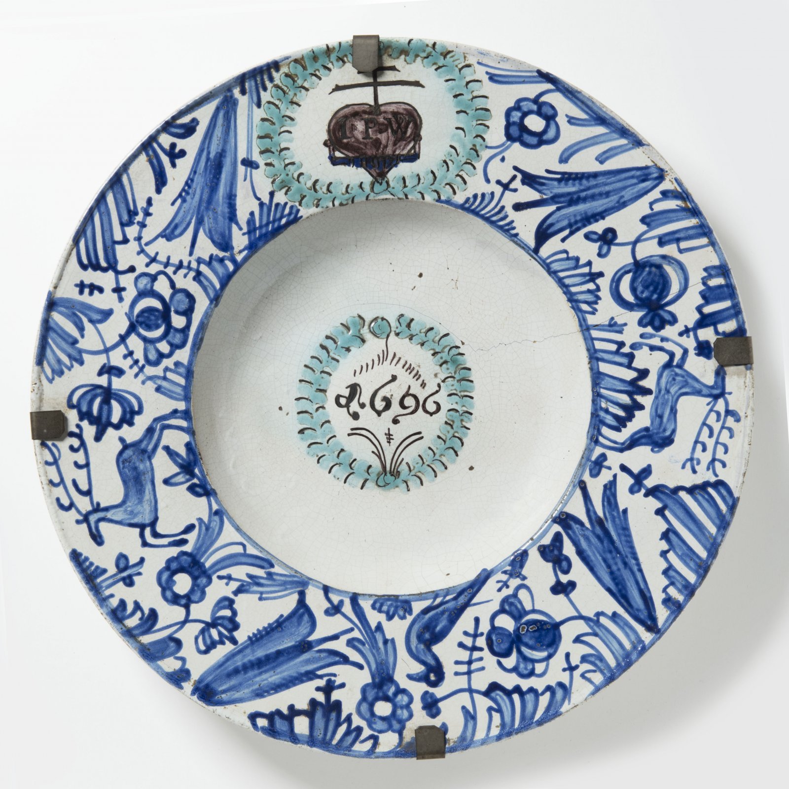 Vzácná habánská fajáns s bohatým malovaným dekorem v kobaltově modré a tyrkysové glazuře. Kromě centrální datace 1696 se nacházejí iniciály IPW v motivu srdce. Habánská, rovněž označovaná novokřtěnská, fajáns zaujímá ve vývoji keramické tvorby významné postavení v mnoha evropských zemích. Stala se také dobře známým pojmem v oblasti umělecké historie a sběratelství. Tvůrci této keramiky, po nichž dostala jméno, byli příslušníci náboženského hnutí novokřtěnectví. Později byli nazýváni habány. Zákonitým znakem květinového dekoru moravských novokřtěneckých fajánsí byla jeho zřetelná nezávislost na reálných přírodních tvarech. Významným zdrojem nových podnětů pro výzdobu novokřtěneckých fajánsí byla ve druhé polovině 17. století modře dekorovaná fajáns z Delft, kam lze zařadit i nabízený talíř s florálními a zvířecími motivy. Talíř pochází z významné pražské sbírky malíře Oldřicha Blažíčka. Velmi dobrý stav zachování, drobná trhlina.
