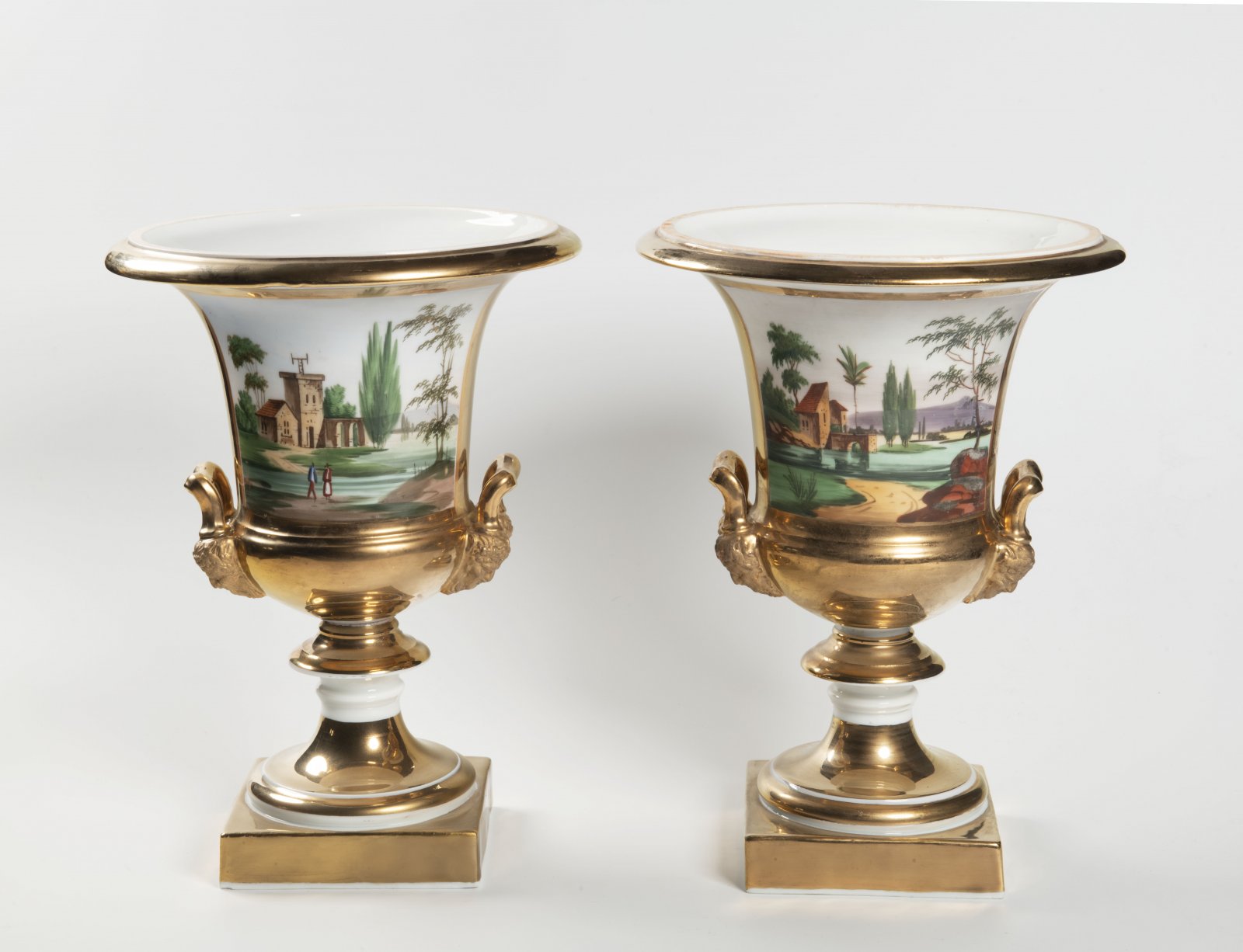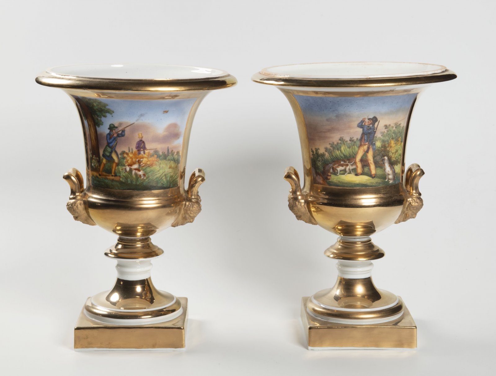 Vázy z pozlaceného porcelánu ve tvaru "medicejské vázy" s bočními uchy ve tvaru maskarónu pochází z pařížské porcelánky. Na jedné straně jsou vyobrazeny postavy lovců a na druhé straně venkovské krajiny. Velmi dobrý stav zachování.