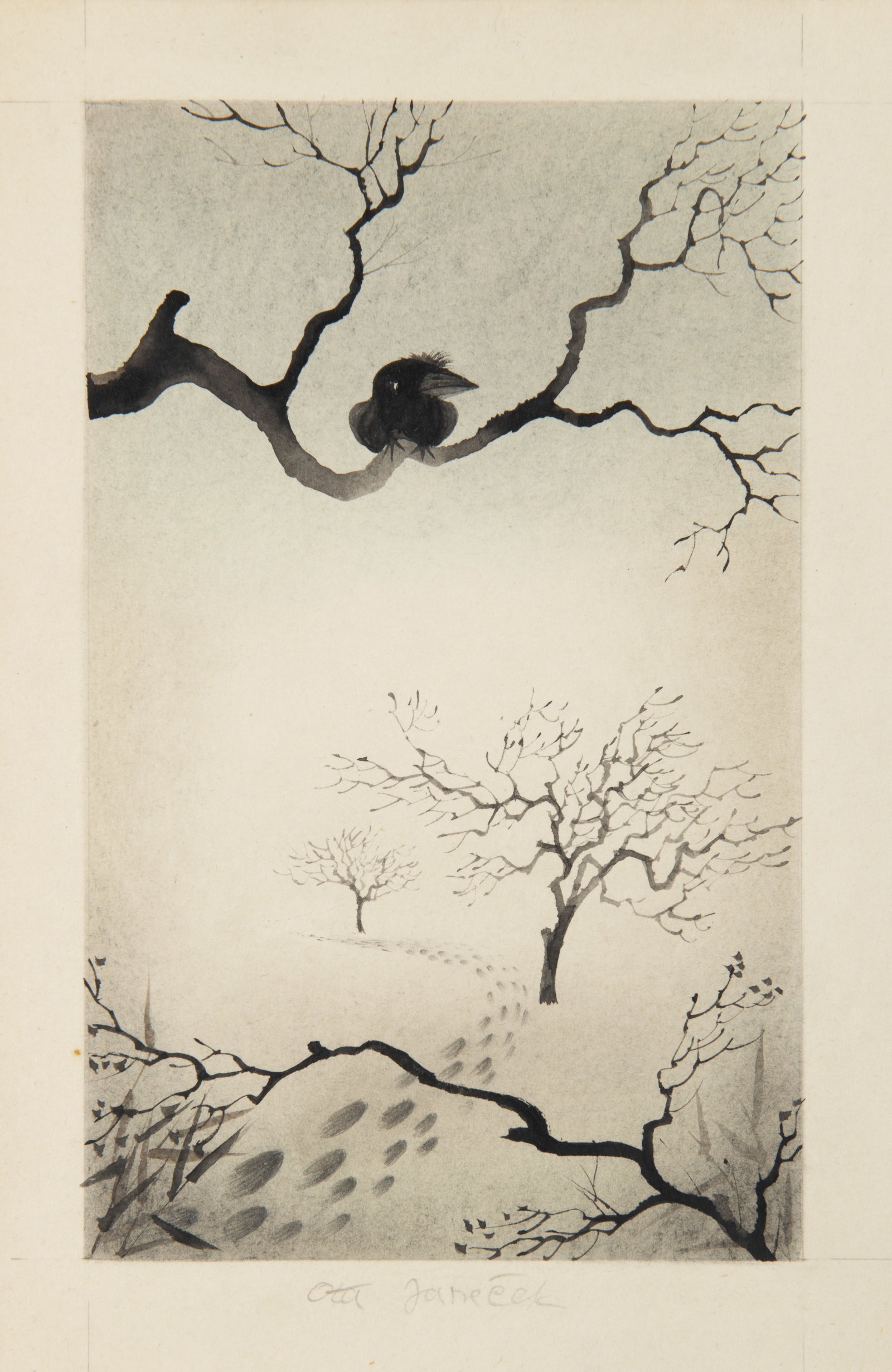 Originální ilustrace Oty Janečka patrně patří do období, kdy pracuje na Básnickém almanachu vydaném v roce 1954. Je to období, kdy vznikají první ilustrace ve spolupráci s nakladatelstvím SNDK, což předznamenává širší spolupráci s médiem knižní ilustrace. Přes všechnu osobitost tvůrčího charakteru Oty Janečka lze jeho tvorbu spojit s českými umělci jako například Jiřím Trnkou pro jeho poetické krajinářské cítění či Zdeňkem Seydlem či Františkem Tichým. Můžeme však nalézt i souvislost ke starším autorům jako je Pieter Bruegel starší. Hlavně zimní motivy tohoto představitele nizozemského malířství 16. století ho upoutávaly melancholickou lyričností holých stromů, jejichž bohaté větvoví se ve své hnědi nápadně zvýrazňuje vůči bílému pozadí zasněženého kraje. Imaginativní náboj, provedený kresebnou dovedností, stojí často na prolínání reality a snu, přesného přírodního detailu s kosmickým celkem pozemského světa v ozvláštňující jednotě mezi člověkem a přírodním světem, kterými Janečkovy ilustrace vyzařují. Dílo pochází z pozůstalosti autora z jeho pražského ateliéru v ulici Bubenská 1376/39.