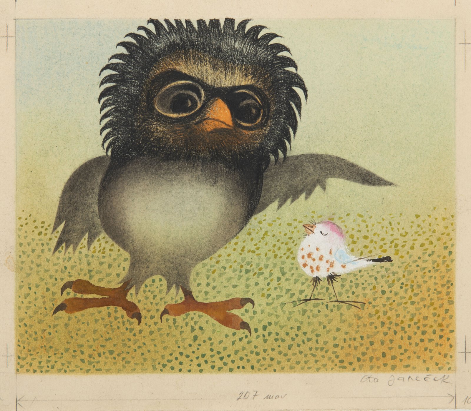 S Františkem Hrubínem spolupracoval Ota Janeček na několika publikacích. V případě nabízené originální ilustrace se jedná o dětskou knížku Pohádka o tom, jak přišla kukačka o chocholku. V období mezi lety 1961 až 1964 Janeček ilustroval celkem 29 knih, přičemž v roce 1963 získává za tuto ilustrátorskou činnost zlatou medaili na bienále v brazilském Sao Paolo. Dílo pochází z pozůstalosti autora z jeho pražského ateliéru v ulici Bubenská 1376/39.