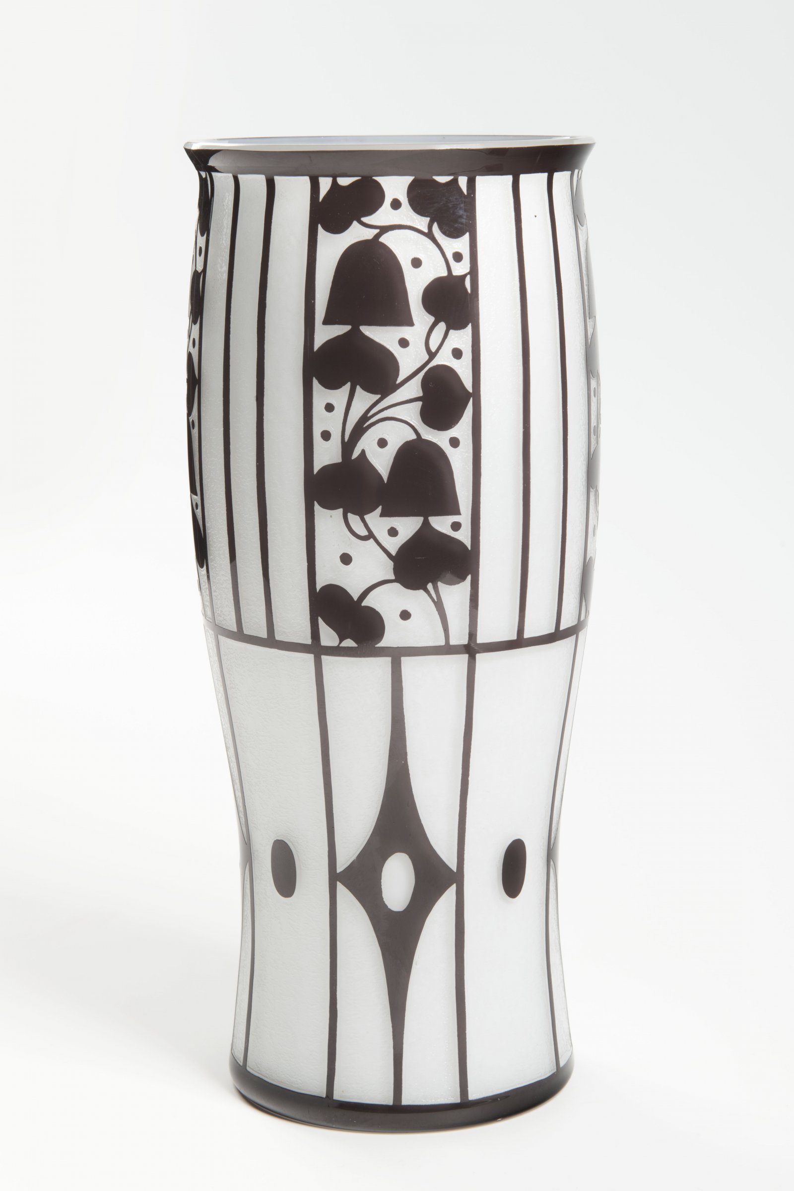 Jedná se o větší variantu vázy dle návrhu významného představitele vídeňské secese Josefa Hoffmanna. Návrh dekorativního motivu kombinující geometrické vzory lipového listu a zvonků byl poprvé představen v roce 1911. V tomto roce byly vytvořeny dvě kolekce s tímto dekorem pro Johann Loetz Witwe a J. & L. Lobmeyr. Vázy tohoto tvaru a s tímto dekorem byly vyráběny v několika barevných variantách. Leptaný dekor byl vytvořen pomocí náročného procesu. U této barevné varianty byl kus, původně vyrobený z bezbarvého skla, nejprve pokryt opalescentním povlakem a poté dále pokryt černou barvou. V několika následných krocích byl dekor leptán z povlaku pomocí kyseliny. Stylizované zobrazení zvonků s listovím v kombinaci s geometrickým vzorem odráží Hoffmannův charakteristický designový jazyk typický pro spolupráci s Wiener Werkstätte. Výborný stav zachování.