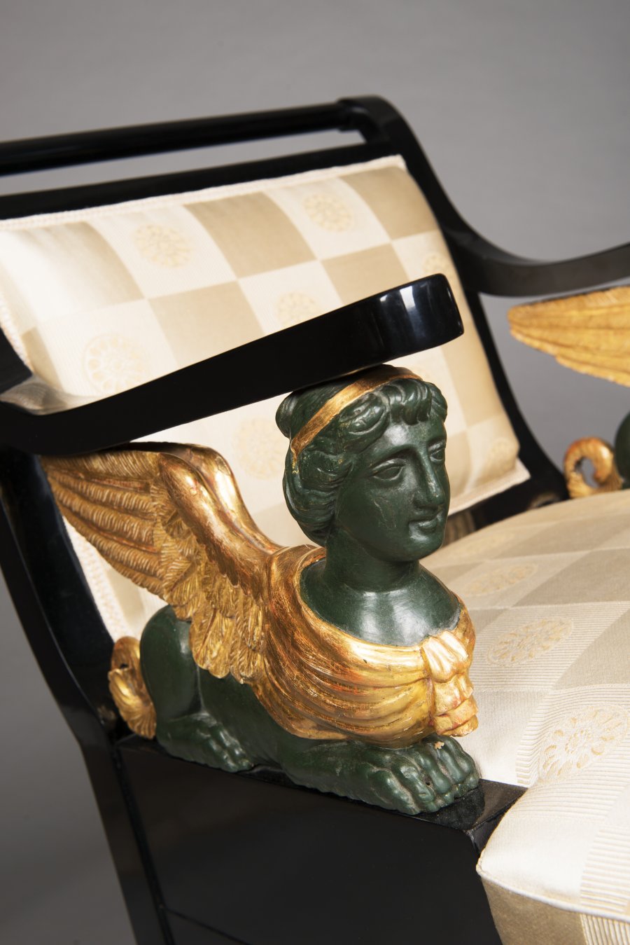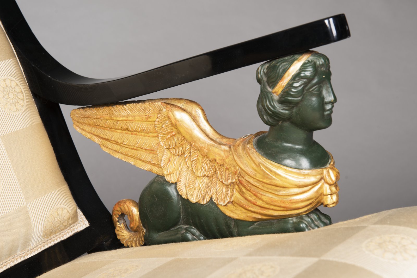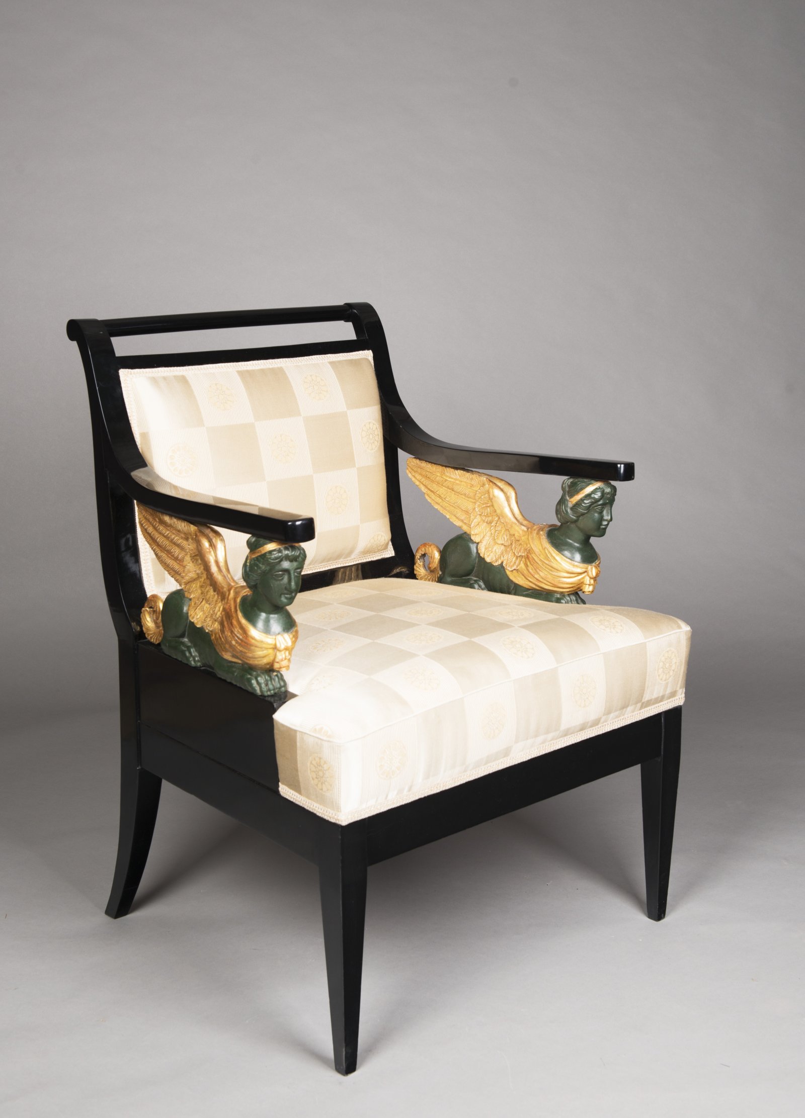 Empírového salonního křeslo charakteristického tvarosloví je dekorováno v partii područek vyřezávanými plastikami sfing. Černěné hruškové dřevo, patinované a zlacené dřevo, restaurováno a nově čalouněno.