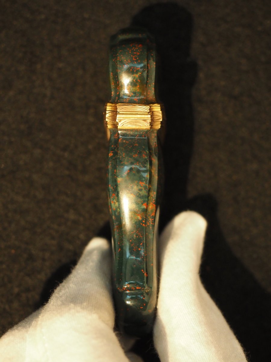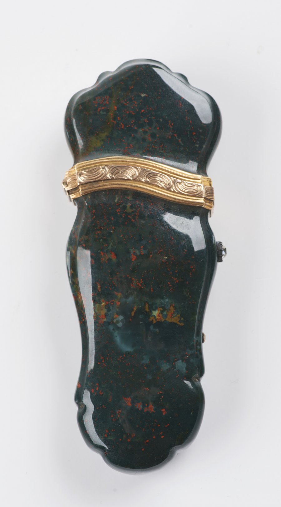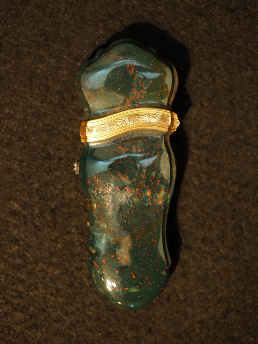 Pouzdro na tabák z leštěného zeleného kamene odráží tvarosloví konce 18. století. Objímka uzávěru ze zlata, zdobena stylizovanými palmetami. Na boční straně vsazen diamant.