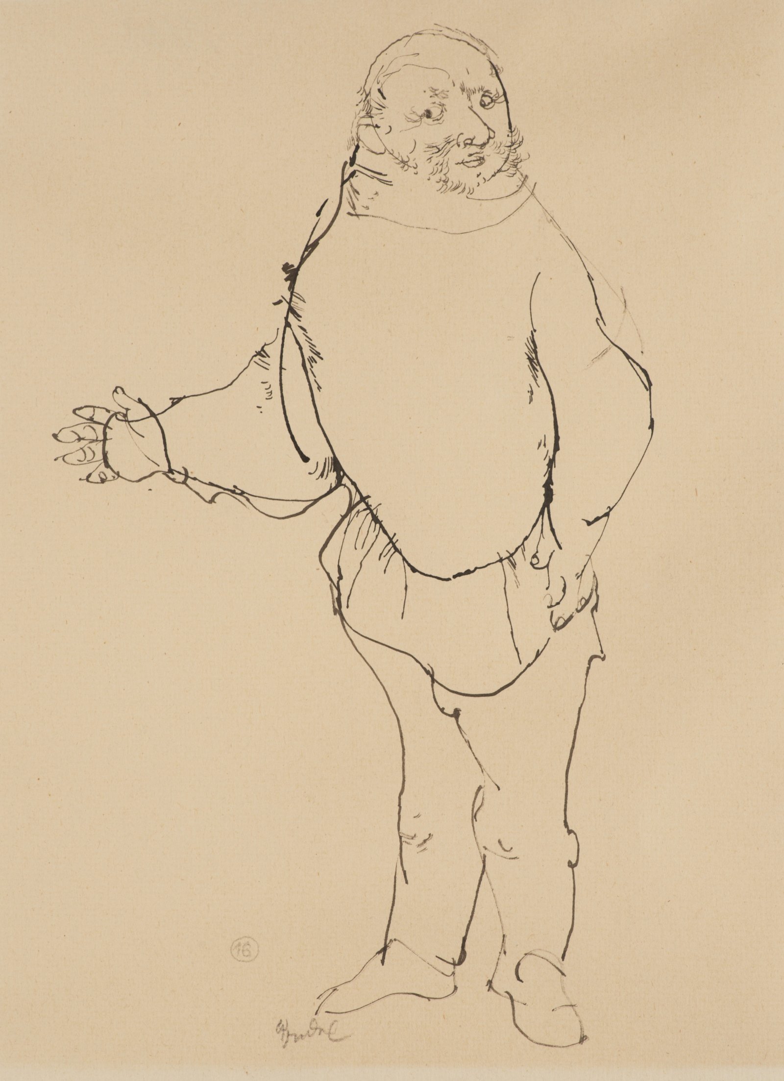 Kresebná studie mužské postavy pochází z pera Jiřího Trnky. Malíř, kreslíř, grafik, ilustrátor, který zanechal nesmazatelnou stopu nejen v českém animovaném filmu, ale vytvořil i jedinečné knižní ilustrace nebo divadelní loutky. Hlavním oborem jeho umělecké činnosti byla ilustrace a jevištní výprava, nejznámější jsou např. knižní ilustrace Karafiátových "Broučků", Erbenových a Grimmových pohádek aj. Maloval krajiny, figurální obrazy i kytice a tvořil dětské hračky. Za práce pro děti byl roku 1940 poctěn cenou České Akademie Věd a Umění v Praze.