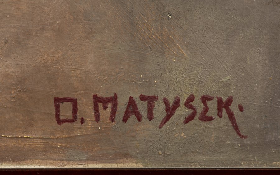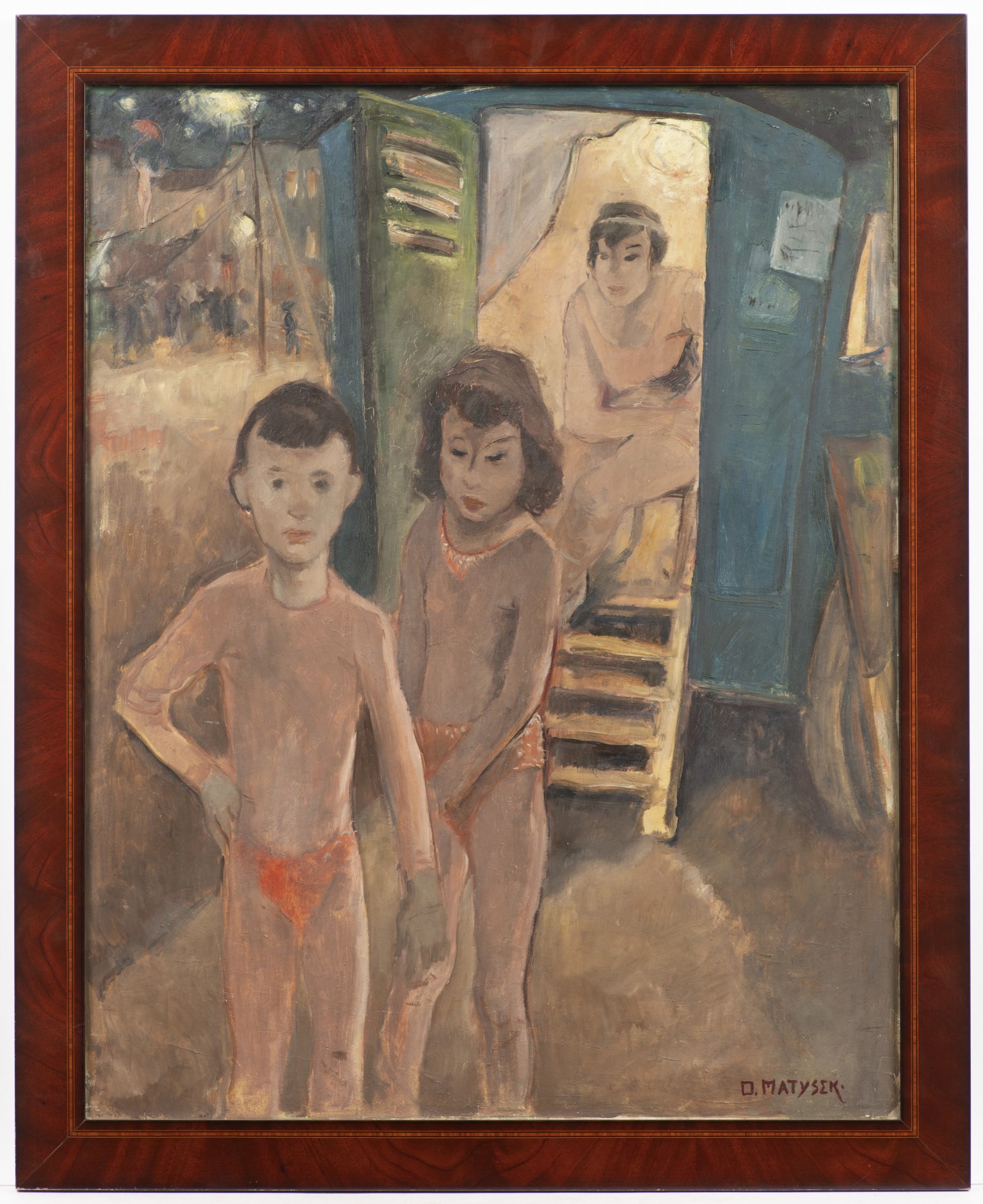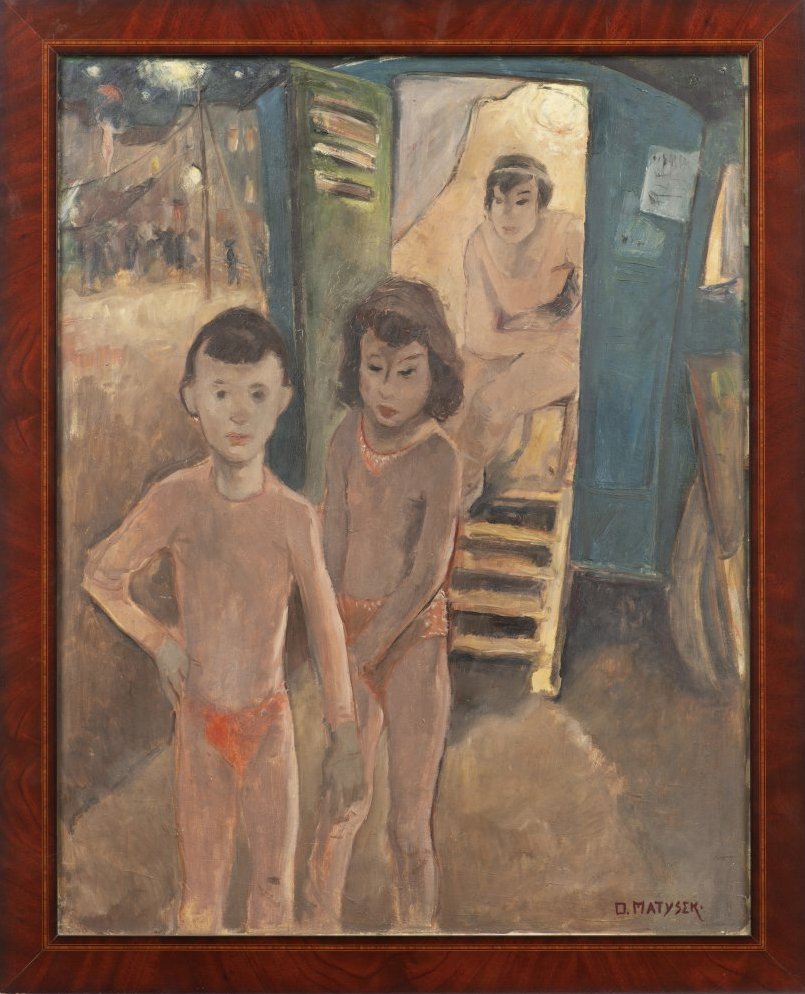 Výjev z cirkusového prostředí pochází od jednoho z bratrů Matysků, Oskara. Jak o tom svědčí i rub obrazu, kde můžeme sledovat skici dalších postav s popiskem orig. O. Matysek/ Paříž (…). Dvojice umělců pocházející z Moravy, z nichž o něco známější bratr Petr, školený u prof. Bachera na Akademii ve Vídni, podnikala studijní cesty do Francie, Itálie, Německa. Ve dvacátých letech strávil O. Matysek šest let ve Francii malováním především krajin, městských scenérií a rušných ulic Paříže. Z tohoto období patrně pochází i procítěná momentka s dvěma dětmi před maringotkou, z jejíž suverénní a zároveň jemně odstíněné malby dýchá francouzský vliv.