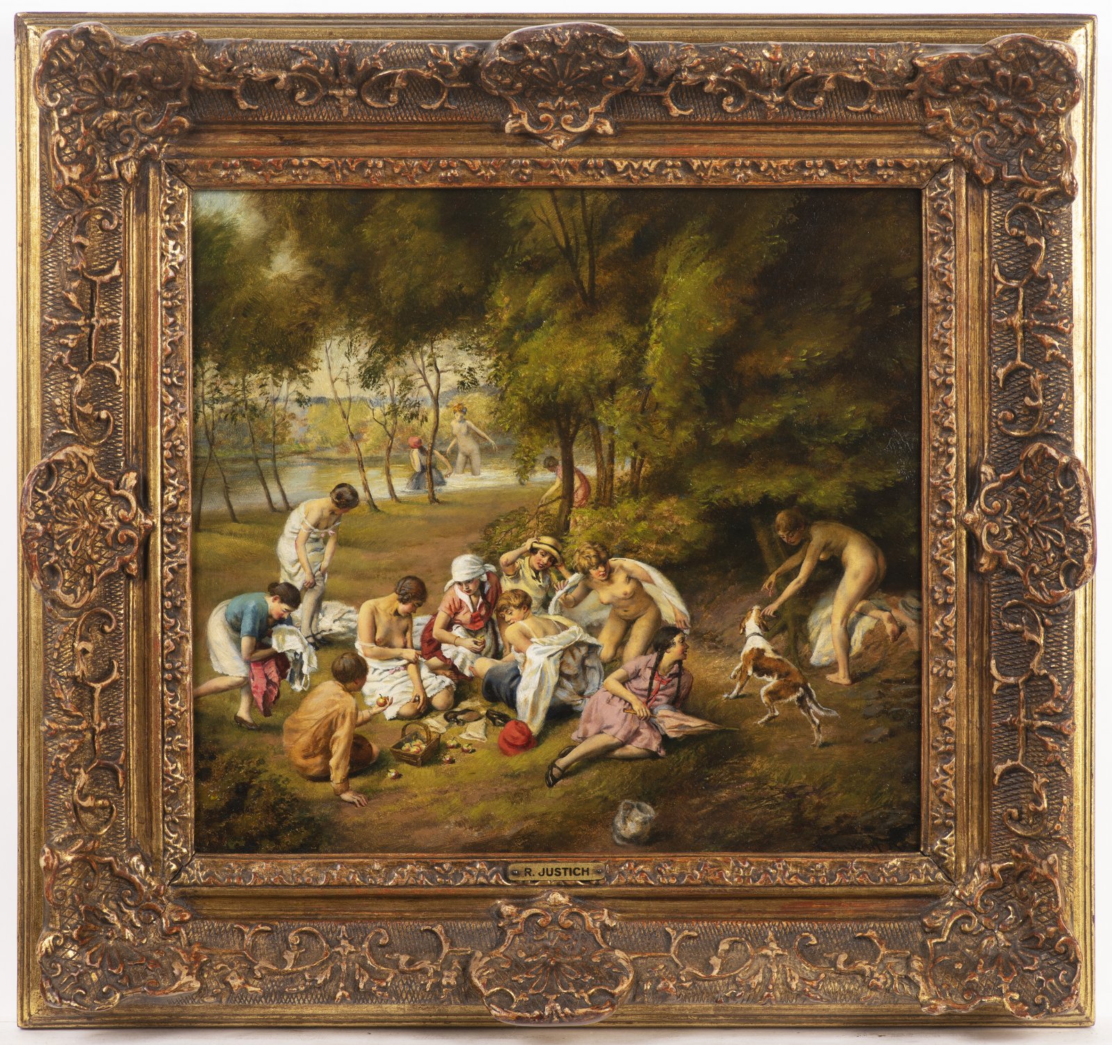 Půvabná drobnopisná malba, zobrazující skupinu mladých dívek při koupání, je ukázkou malířského umění Rainholda Justicha. Na obraze vyzařujícím radostnou letní atmosféru zachytil malíř dívky při pikniku a hraní si se psem, v zadním plánu, jak se koupou ve vodě. Autor po přípravě na uměleckoprůmyslové škole prošel dalším školením na pražské Akademii výtvarných umění (r. 1902), kde studoval ve speciální škole prof. V. Hynaise. Tvořil zejména podobizny, akty a figurální náměty v moderním názoru na impresi pohybu i barvy.