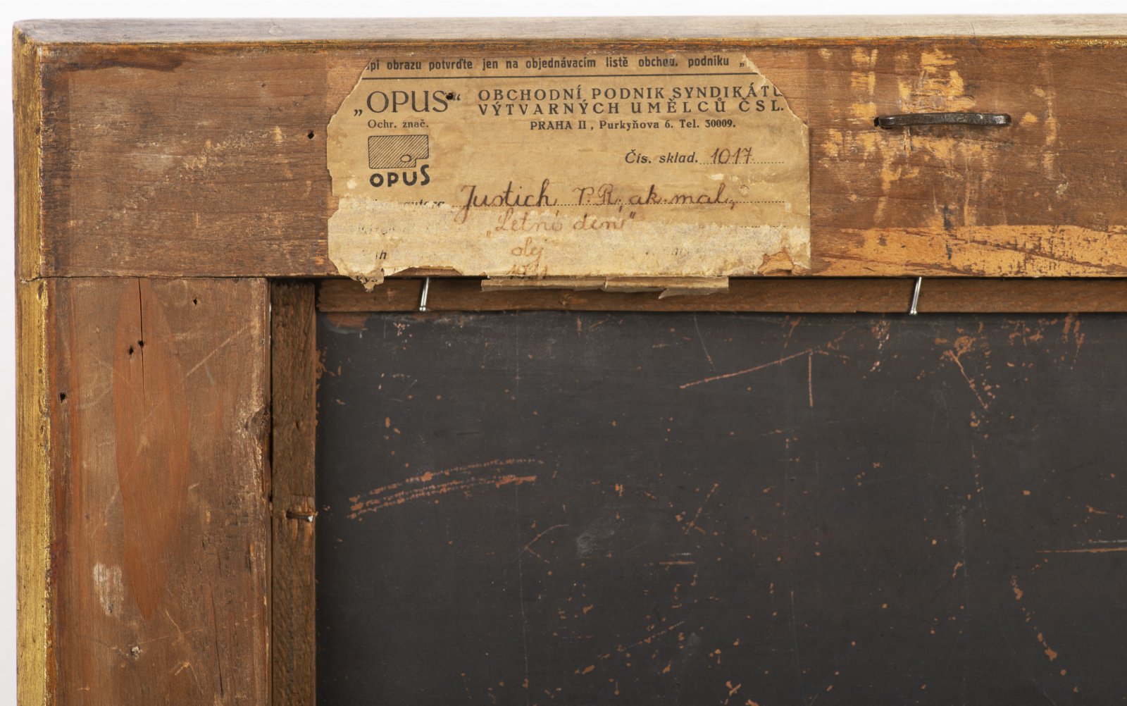 Sign. vpravo dole: Justich R., vpředu dole na rámu štítek: R. JUSTICH. Vzadu štítek OPUS: Justich V.R. ak. mal./ Letní den/ olej/ 1931