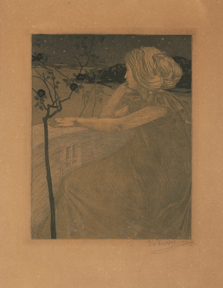 Převážná část Preissigovy tvorby je zaměřena na grafiku, jejíž techniky studoval a rozvíjel za svého pobytu v Paříži, kam mohl odjet díky podpoře rodičů už v roce 1897. Zpočátku pracoval u A. Muchy a dále pokračoval ve studiu grafických technik u E. Delauna. Velmi talentovaný Preissig se rychle zorientoval v pařížském prostředí a osvojil si již vlastní dokonalý styl grafické dekorativní práce, ve kterém se zanedlouho dokázal oprostit od vlivu A. Muchy. Předkládaná práce zachycující dívku sedící za letní noci u keříku s růžemi, a za níž se klene nekonečnost hvězdné oblohy, je krásnou ukázkou autorova secesně lyrického vidění světa.