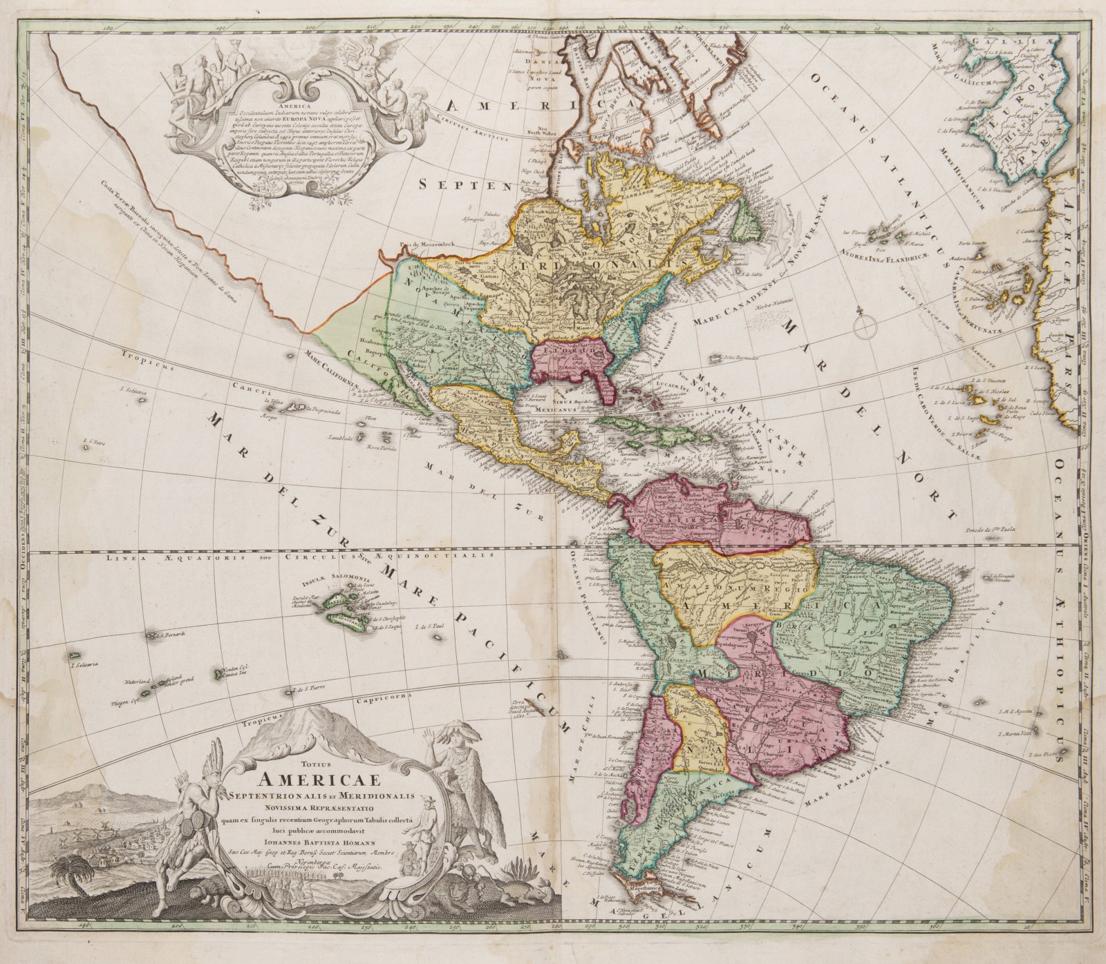 Staře, plošně a liniově kolorovaná mědirytinová mapa zobazuje americkou pevninu včetně její fiktivní nadhodnocené severozápadní části. Východní okraj listu zachycuje ještě jihozápadní část Evropy a pobřeží západní Afriky. Titul vlevo dole v rozsáhlé kartuši s pohledem do krajiny, vyobrazením místní zvířeny a orámováním postavami dvou domorodců. Vlevo nahoře další kartuše s textem o objevování kontinentu Španěly a Portugalci, s alegorií katolizace obyvatel. Mapa nese skvrny od vlhkosti po okrajích a podél přeloženiny listu.