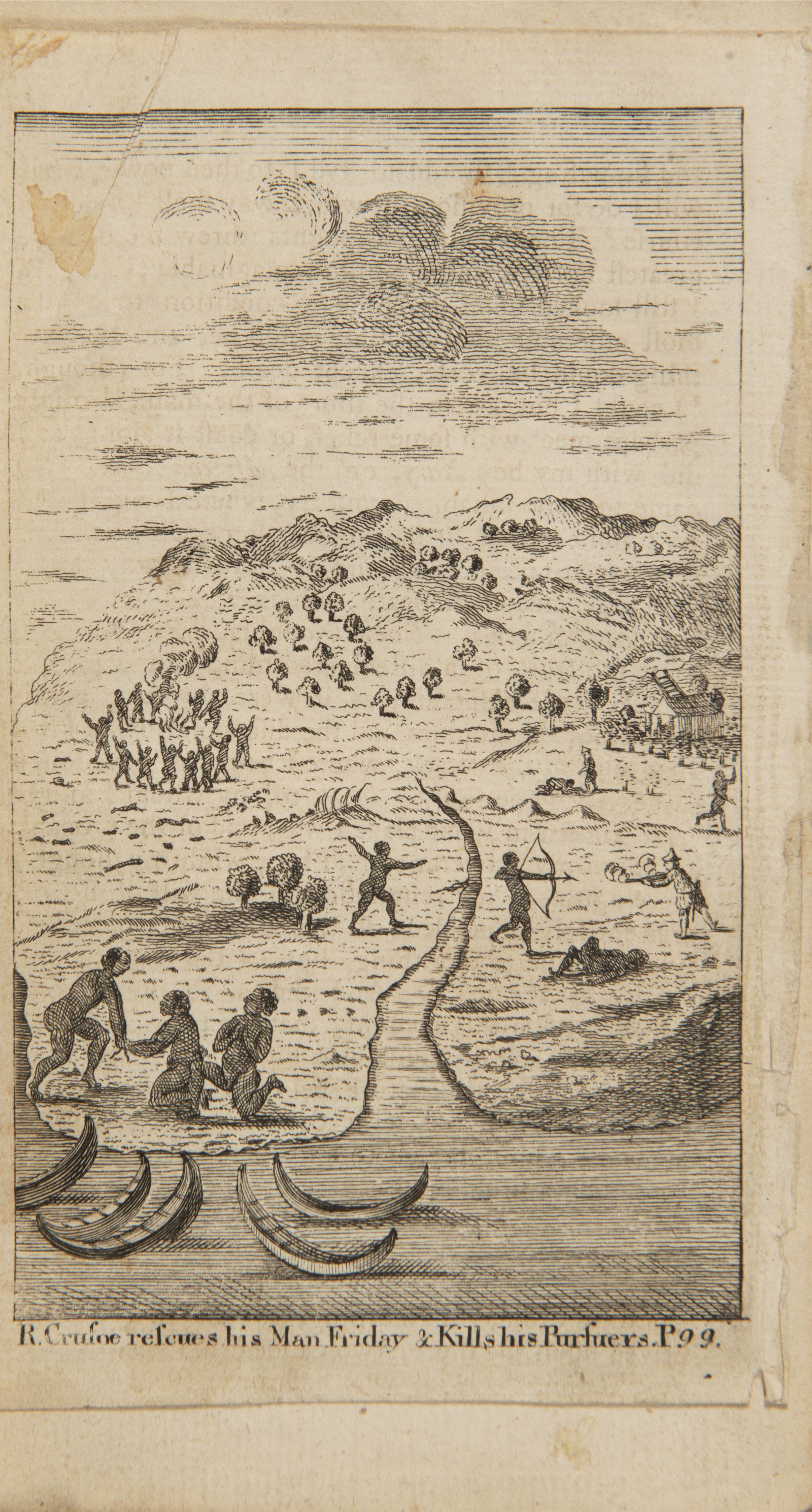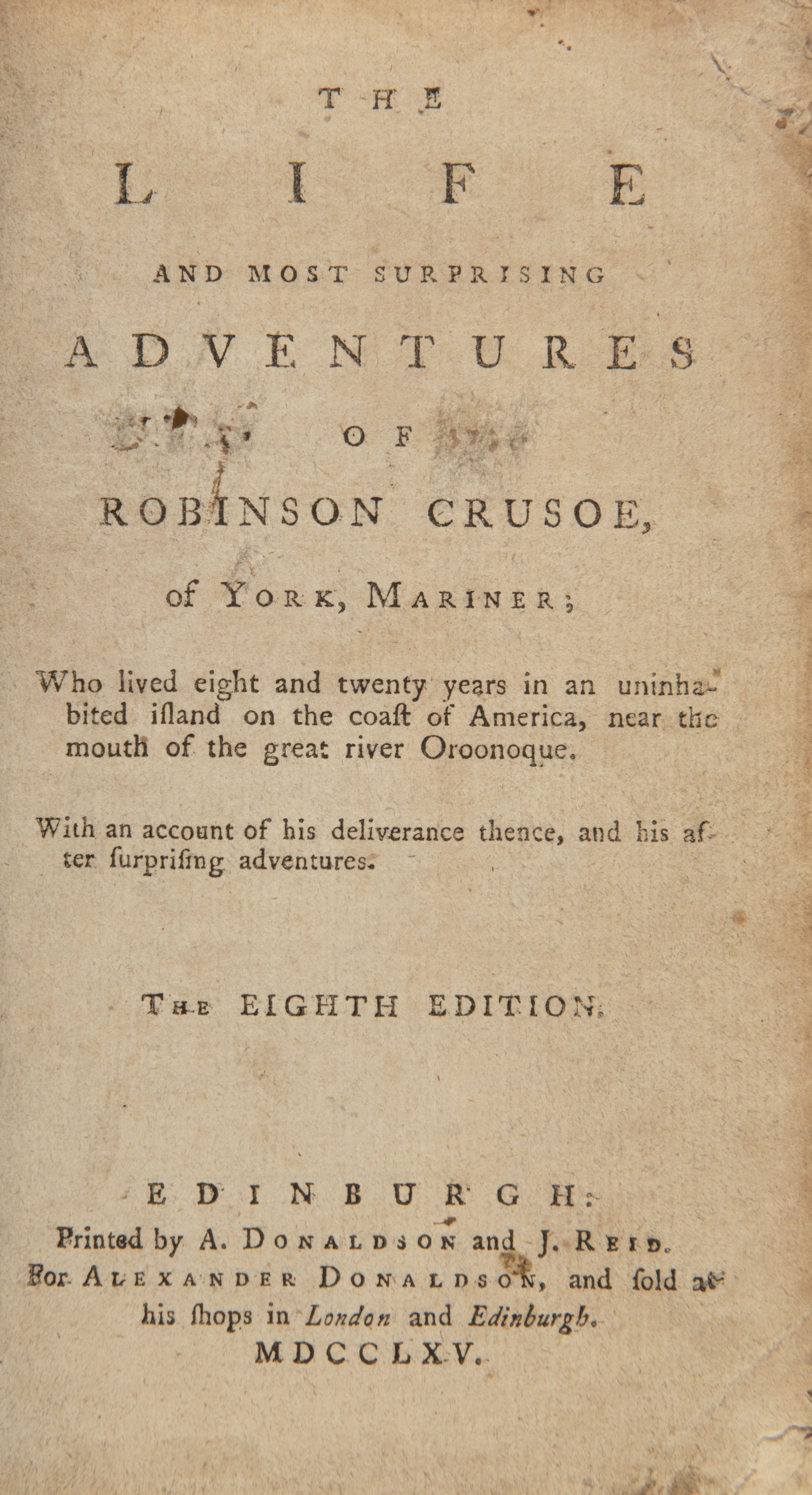 Celý titul: "The Life and most surprising Adventure of Robinson Crusoe, of York, Mariner, who lived eight and twenty years in an uninhabited island on the coast of America, near the mouth of the great river Oroonoque. With an account of his deliverance thence, and his after surprising adventures." Vydal A. Donaldson tiskem firmy A. Donaldson a J. Reid, 1765. 8. vyd. Celkem: 4 s., 328 s., se 2 mědirytinovými tabulemi. Několik rytých iniciál a ozdobných linek. Rané vydání, jedno z prvních mimo Londýn. Jeden z nejsilnějších, nejvydávanějších, nejpřekládanějších, často zfilmovaných i jinak zobrazovaných literárních příběhů všech dob ve vzácné sběratelské edici a velmi dobrém stavu.
