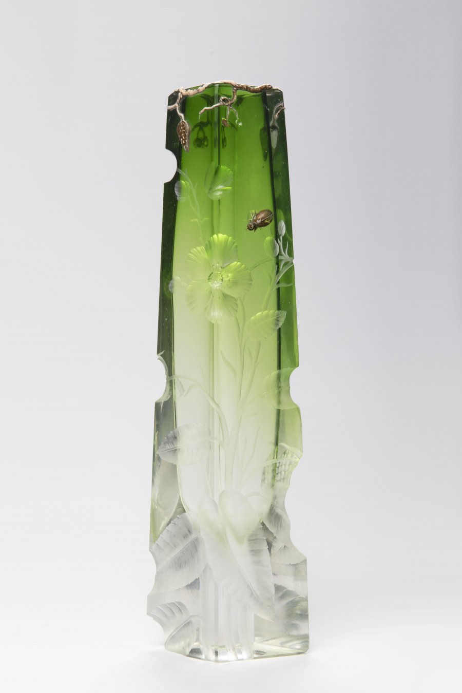 Velmi kvalitní ukázka tzv. Karlovarské secese, vzniklé kolem roku 1900. Váza je zdobena hluboko řezaným rostlinným dekorem růží a emailem provedenými oddenky a broučky. Váza je z čirého zeleně nabíhaného skla. Výborný stav.