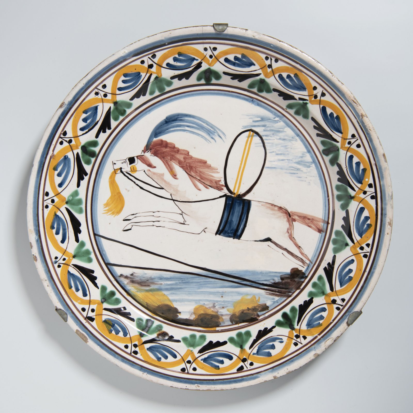 Pestrobarevná vzácná fajáns představuje koně v cirkusové výstroji přeskakujícího překážku v manéži.
