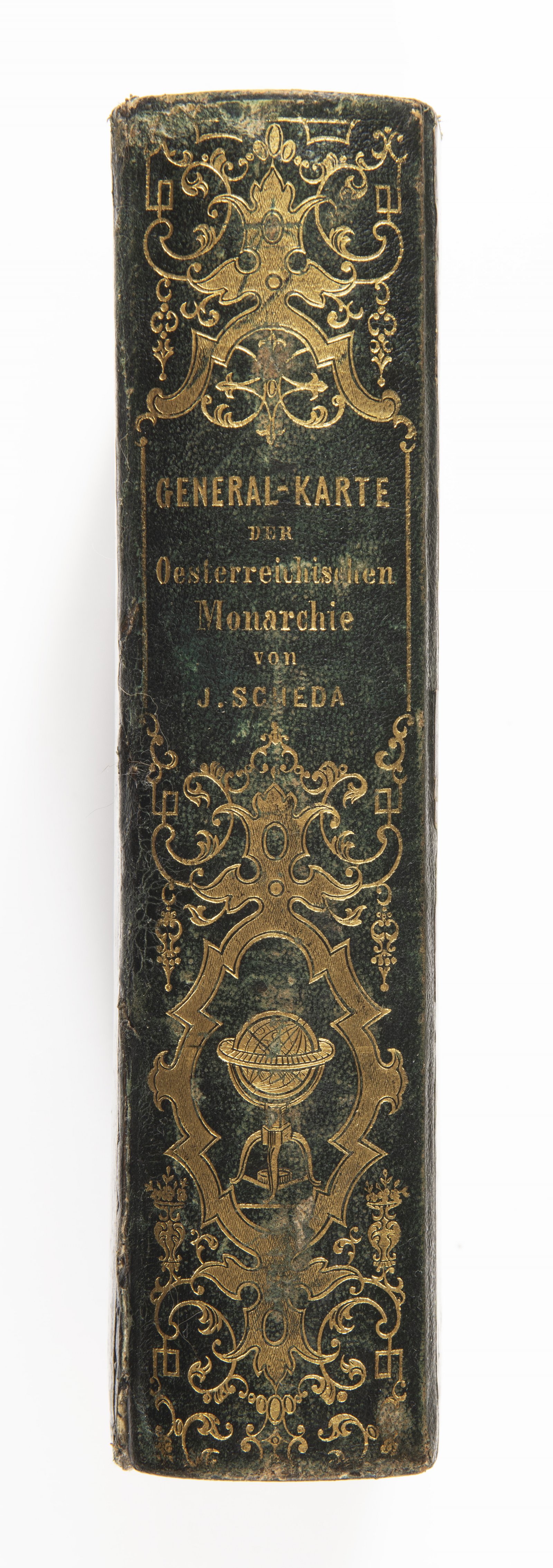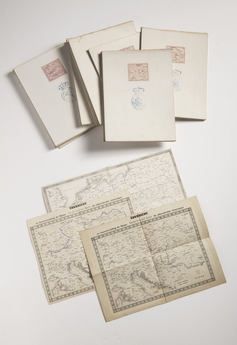 Jede Landkarte bestehend aus 6 Segmenten, die auf zeitgenössische Weise auf Leinwand aufgeklebt sind, mit edlem alten Bibliotheksstempel versehen, dekorativer Abschlussrahmen. Die Titelseite ist mit einer kaiserlichen Widmung und einem umfangreichen Kupferstich versehen, der Allegorien aus der Landvermessung und dem figuralen Bereich zeigt. Das gesamte Set ist in einer Original-Lederhülle (26 x 21 x 6,5 cm) mit dekorativ vergoldetem Rückentitel verwahrt. Das Exemplar ist in hervorragendem Zustand und hat hinsichtlich seiner Vollständigkeit Seltenheitswert.