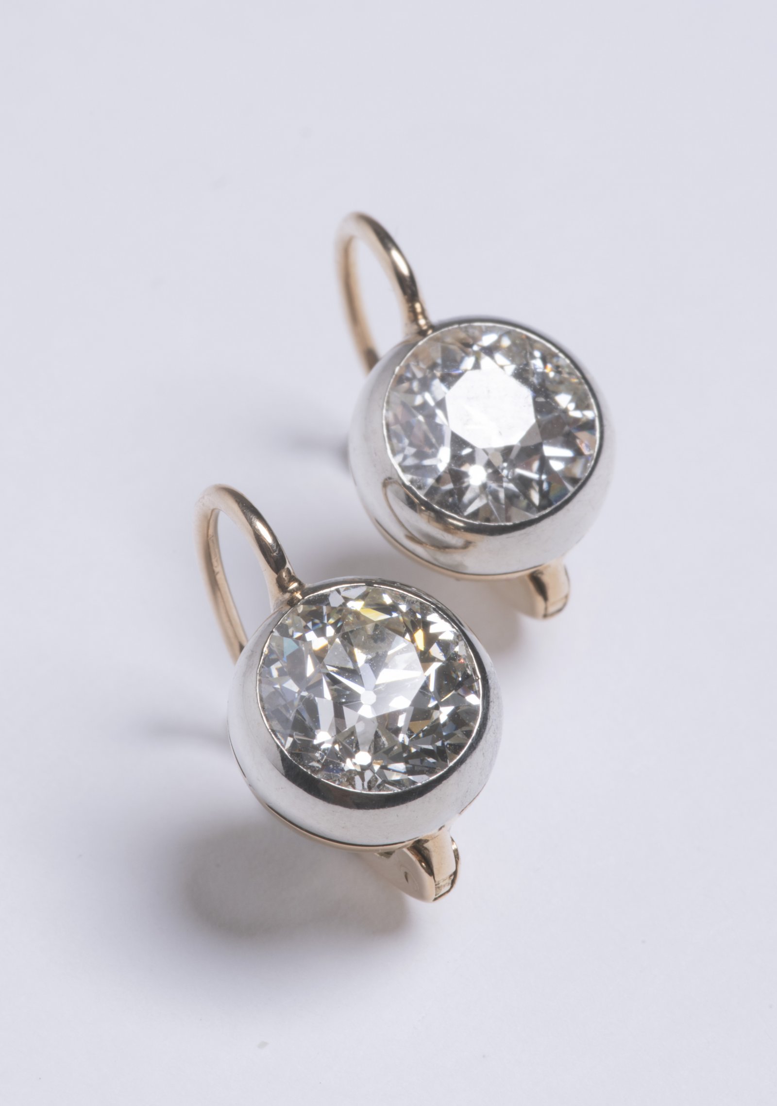 A pair of earrings with a total weight of 3.56 g made of gold alloy without indication of purity, set with one natural diamond on each earring of an old European brilliant cut. Diamond weight 1.85 and 2.15 carats. Expert assessment attached.
