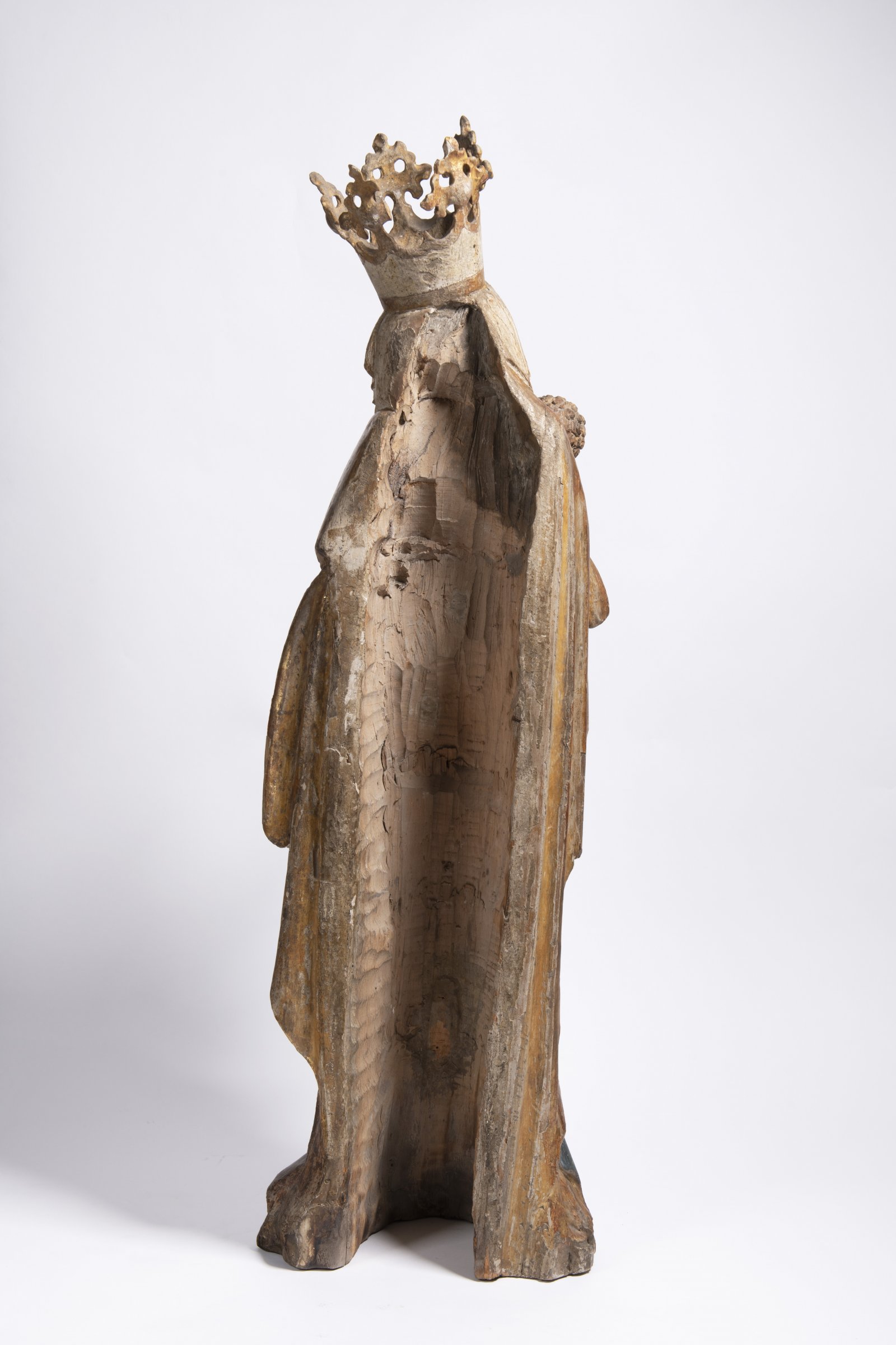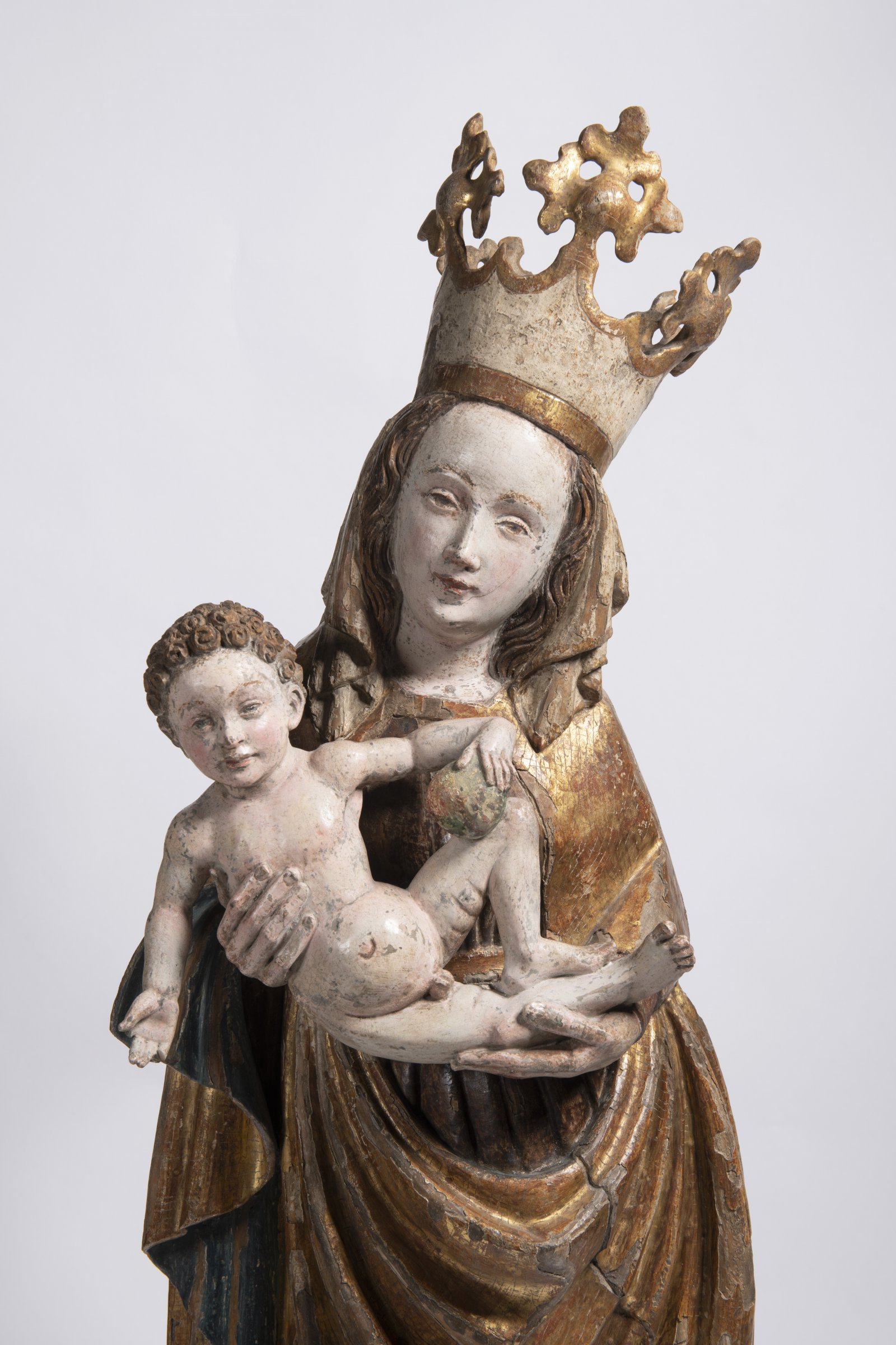 The statue of the Madonna and Child in the fading "beautiful style", also known in Germany as the soft style (weicher stil), which was represented in Bohemia, for example, by Master Theodoric. The most important Czech period statues of the Madonna from the Gothic period were created in this style. The beautiful style connects the sensory side with the content message and creates a cultivated concept in painting and sculpture - the figures are shrouded in richly pleated drapery, esophageal bends and the typical face is lively and noble. In changing daylight, it often appears to be expressively variable. The legacy of French Gothic is reflected here in the dynamic play of light and shadow in the folds of clothing. The Madonna carries on the hands of Jesus, who holds an apple - an attribute of sovereign power. She is dressed in a gold cloak with a blue background, with a crown on her head. The finely drawn faces of both figures are lined with contrasting detailed carvings of wavy hair, in the case of Mary partially covered by a veil. The sculpture is in very good condition and with the original polychromy.