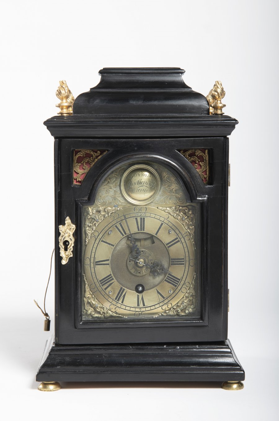 Small baroque clock with alarm clock in a black box with gilded bronze ornament and red cloth. Silver dial, with baroque ornament on the sides and engraved ornament above it, with Roman and Arabic numerals. Signed above: Andreas Hochenadl Wienn. Machine fully functional, restored.