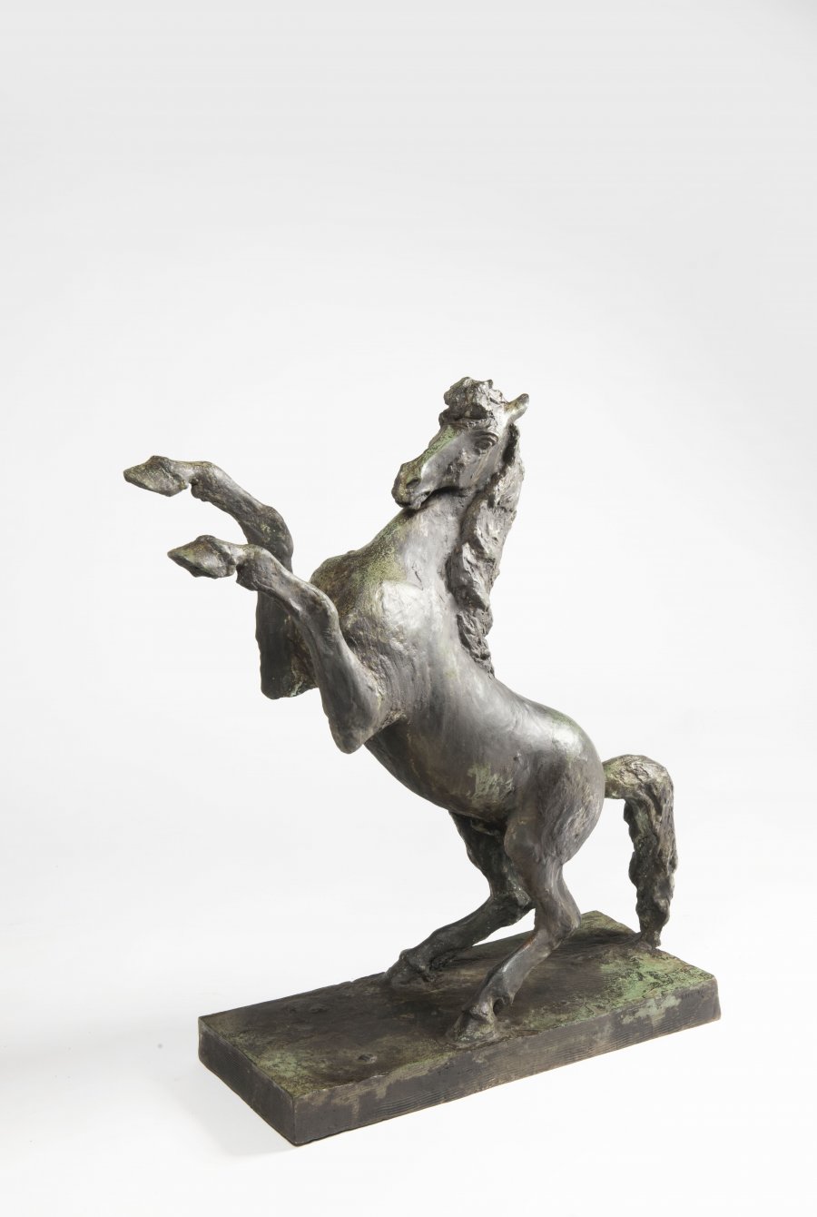 Antonín Kalvoda belonged to important and prolific Czech sculptors, his well-known works include, for example, a bust of Tomáš Garrigue Masaryk, Tumba in Ostrava, or animal sculptures. He first studied in Brno, then the Academy of Fine Arts in Prague (1929-1934). The offered sculpture of a prancing horse, which dates back to the early days of his study in Prague, is unique not only in its size but also in the masterful quality of bronze processing.