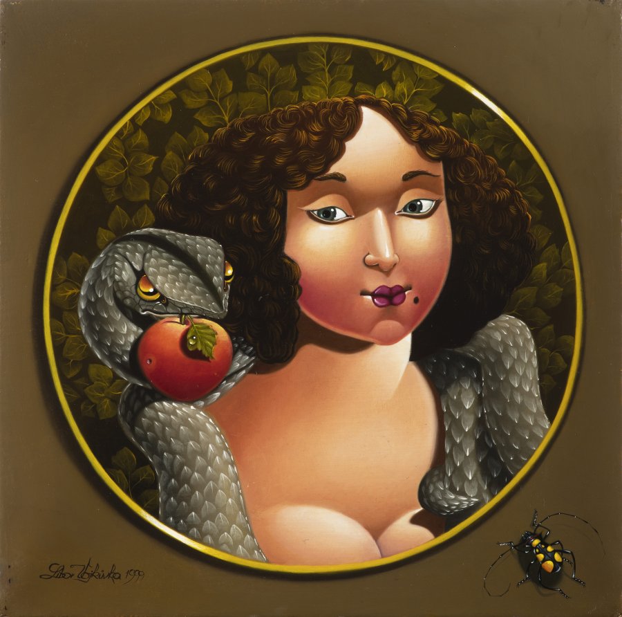 Libor Vojkůvka is one of the Czech naive painters and was known mainly for his travel experiences and the peculiar nature of the folk entertainer. His humor is also evident in the longer Eve with the Snake, where there is obvious exaggeration in the processing of that biblical theme, but with very precise details. The work comes from the estate of Květa Fialová and is said to be her own portrait.