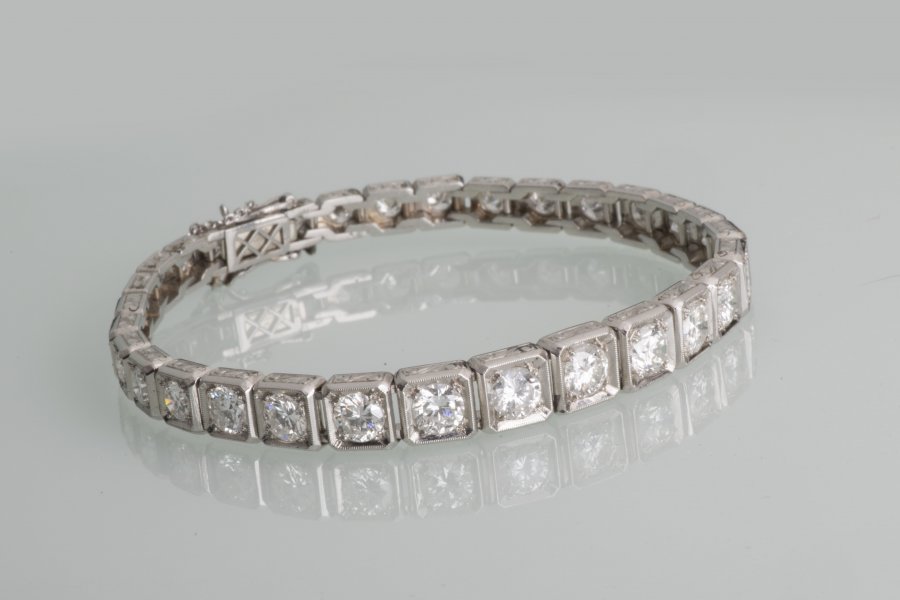 purity: 950/1000, hallmarked, length of the bracelet 19 cm, safety clasp and safety chain on both sides, total of 31 diamonds, approx. 7,10 ct. Quality: VS, colour: E-F, cut: brilliant. Art Deco bracelet with brilliant-cut diamonds in exceptional quality with high clarity stones by a jeweler monogrammed E.K.