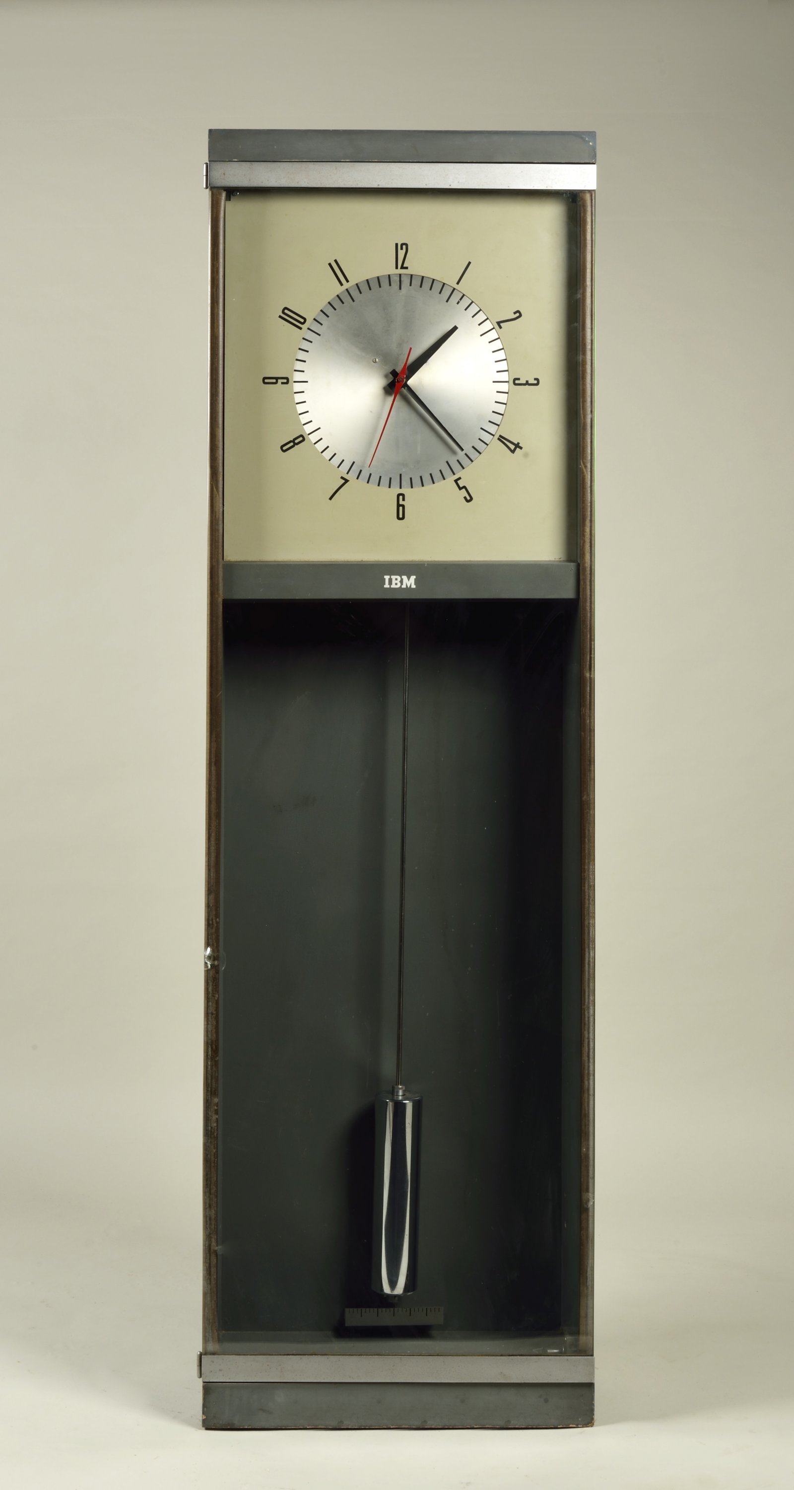 Werbeuhr der Firma IBM, geschwärztes Holz, geläufiges verchromtes Metall.