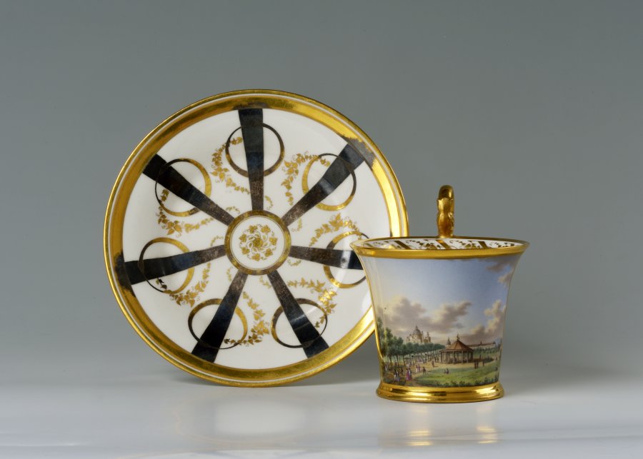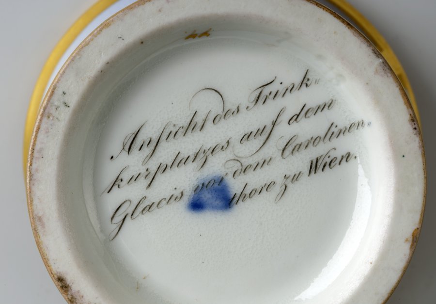 Die traditionelle „Caffee-Tasse mit Schneckenhenkel“ der Biedermeier-Zeit dient hier als Bildträger für eine seltene Wiener Vedute: “Ansicht des Trinkkurplatzes auf dem Glacis vor dem Carolinenthore zu Wien“, wie in der Wiener Manufaktur üblich, ist die Darstellung auf der Unterseite der Tasse in Schwarz bezeichnet und gibt uns bis heute Auskunft über längst verloren gegangene Raumsituationen des Biedermeierlichen Stadtbildes.