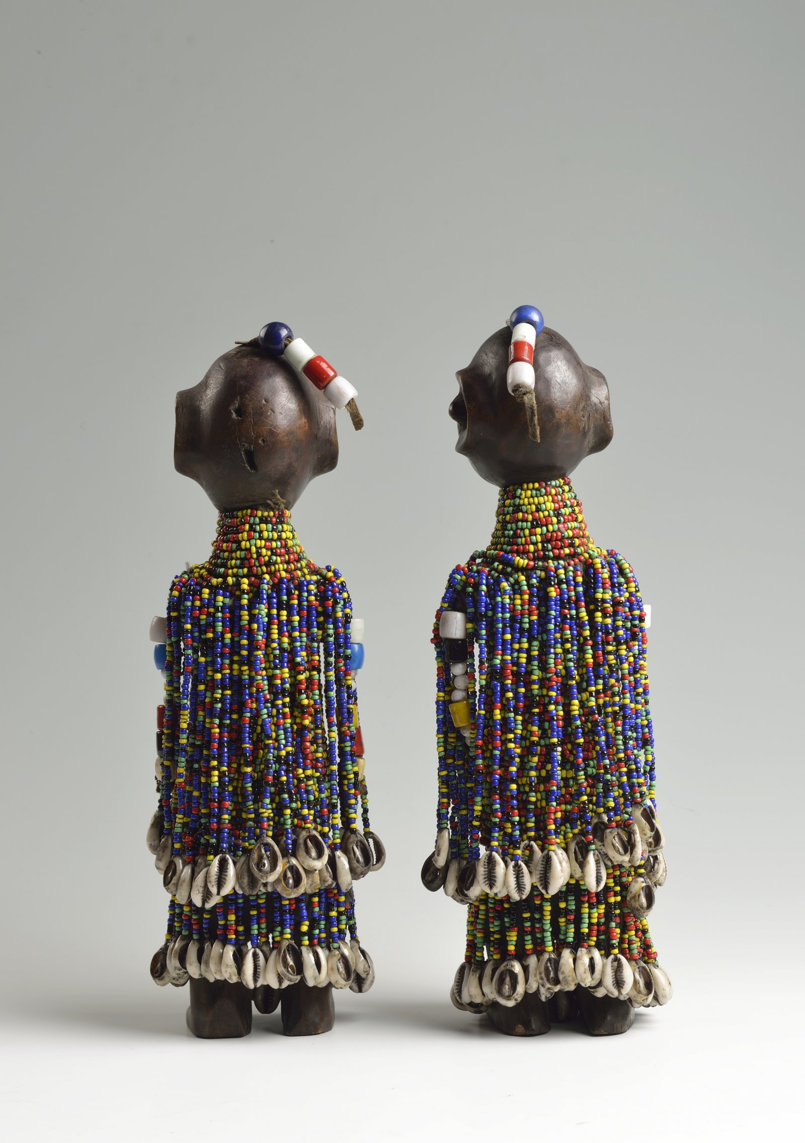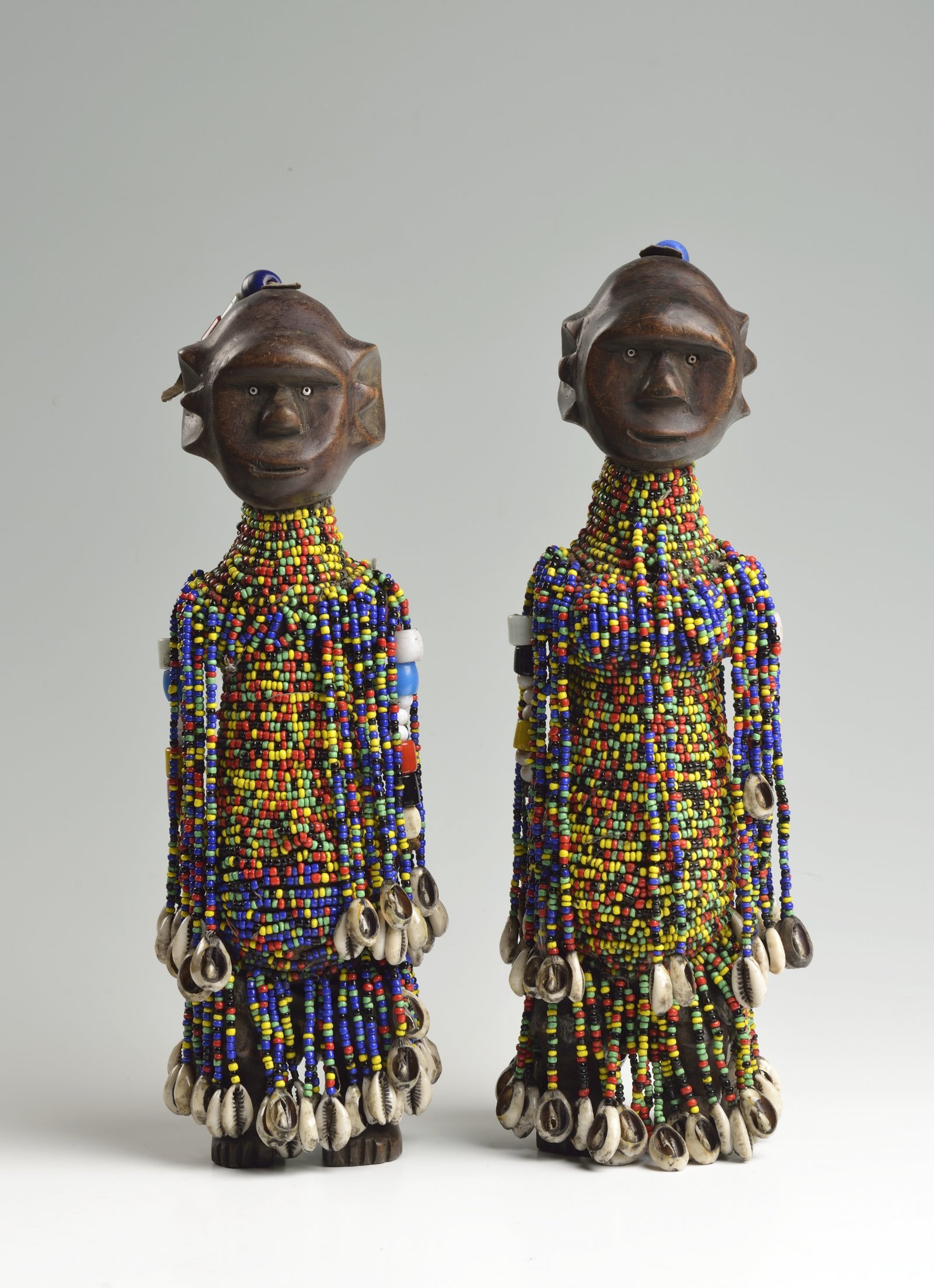 Symbolisches Vorfahrenpaar - Mann und Frau, wurde zur Verbindung mit Vorfahren bei Ritualen und Zeremonien benutzt. In Familien und in Dörfern wurde für sie ein spezifischer Platz reserviert, und man hat ihnen einen besonderen Respekt erwiesen. Exotisches Holz, Gablonzer Glasperlen. Begutachtung PhDr. Marie Imbrová.