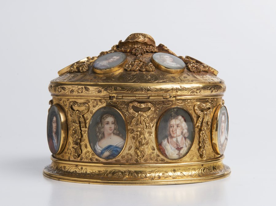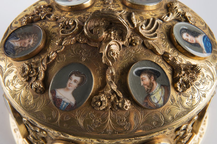 Messing vergoldet, Gouache-Malerei auf Knochen, Glas. Präzise handwerkliche Verarbeitung aus der Zeit des zweiten Barock. Die ovale Dose ist auf dem Deckel mit sechs und am Dosenumfang mit acht Miniaturen besetzt, die Porträts bedeutender Persönlichkeiten aus der französischen Geschichte zeigen. Die Außenseite ist aus vergoldeter Bronze gefertigt und mit Gravierungen und Maschen- und Blütenmotiven in einer Girlande verziert. An der Innenseite ist eine Seidenpolsterung angebracht.