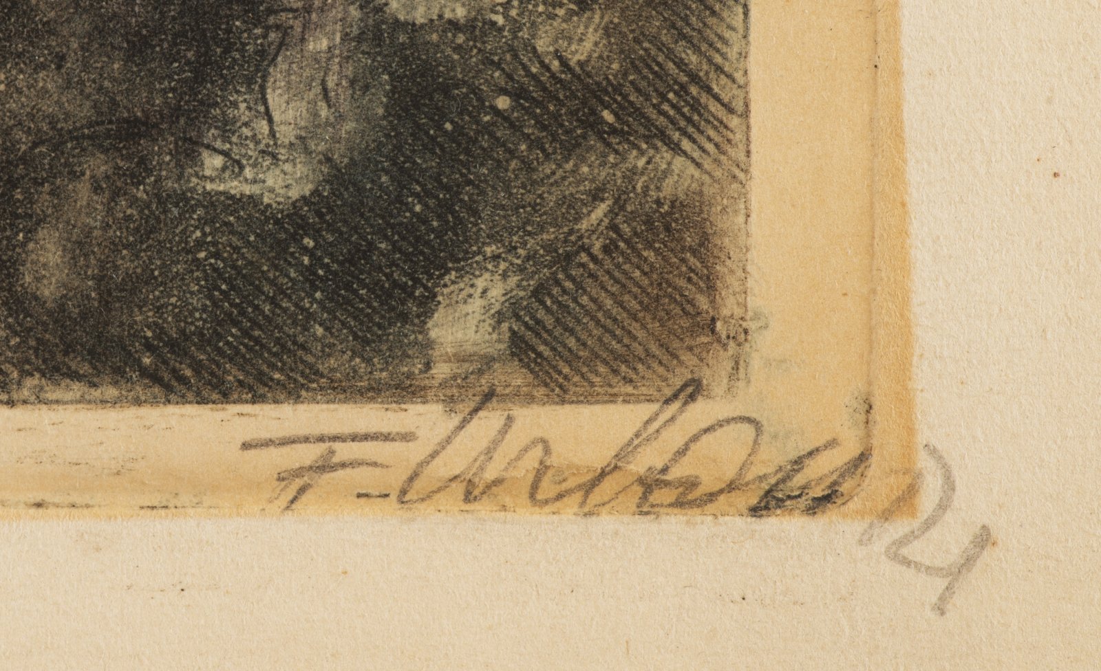 Kaltnadeltechnik; unten rechts signiert mit ‚F. Urban‘. František Urban, einer der ersten Schüler von František Ženíšek an der Prager Akademie für Kunst, Architektur und Design, ist als Maler religiöser, allegorischer und symbolistischer Themen bekannt. In seinem umfänglichen Werk widmete er sich dem monumentalen aber auch dem kleinen dekorativen Schaffen. Er schuf eine Reihe von Illustrationen für Märchen und zeichnet für den Entwurf der österreichischen Einhundertkronenbanknote ebenso verantwortlich, wie für diverse Wertpapiere und Plakate. Seine erzählenden, pietätisch gestimmten Themen stimmen mit den Themen der symbolistisch gestimmten Dekadenz Ende des 19. Jahrhunderts überein. Der essenzielle Teil seiner Arbeit beruhte in Entwürfen für Kirchenausgestaltung und Bleiglasfenster.