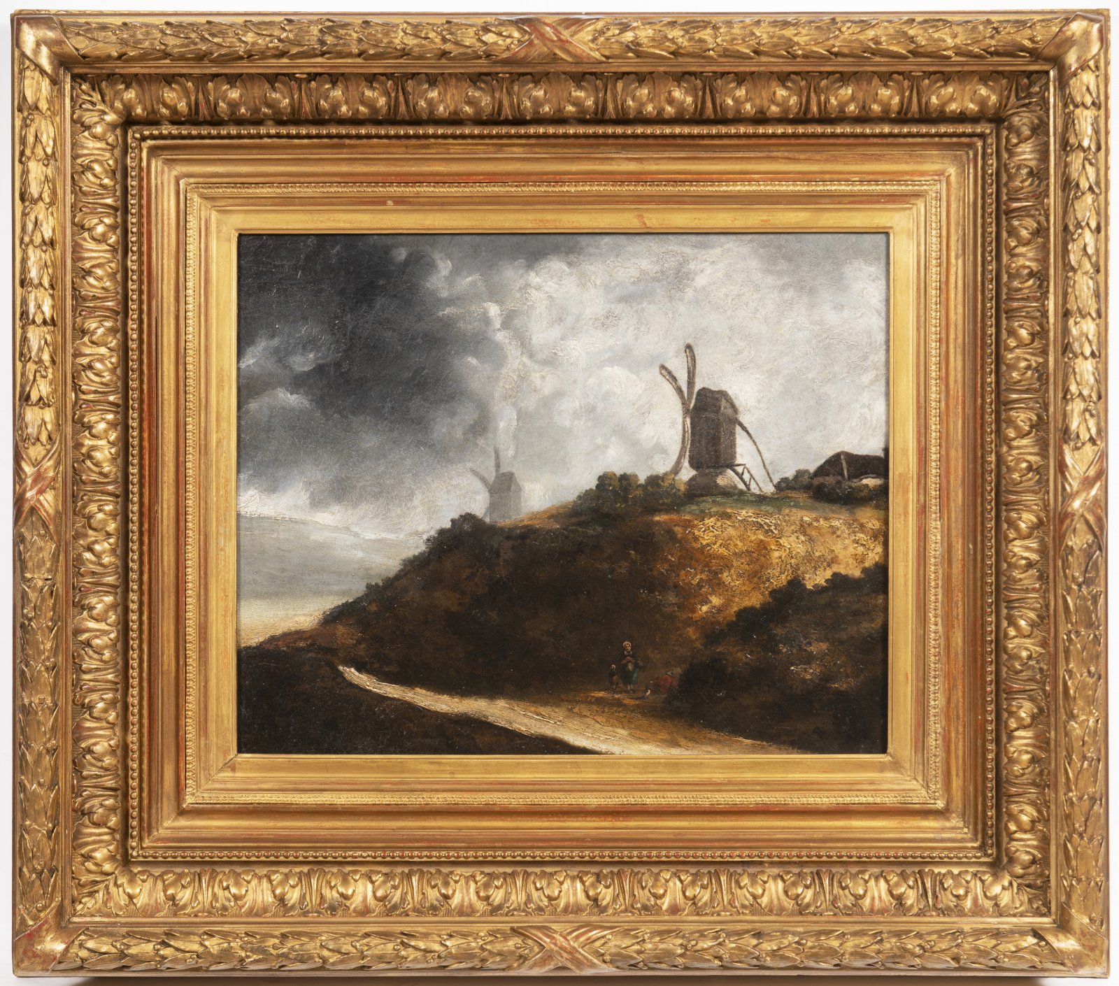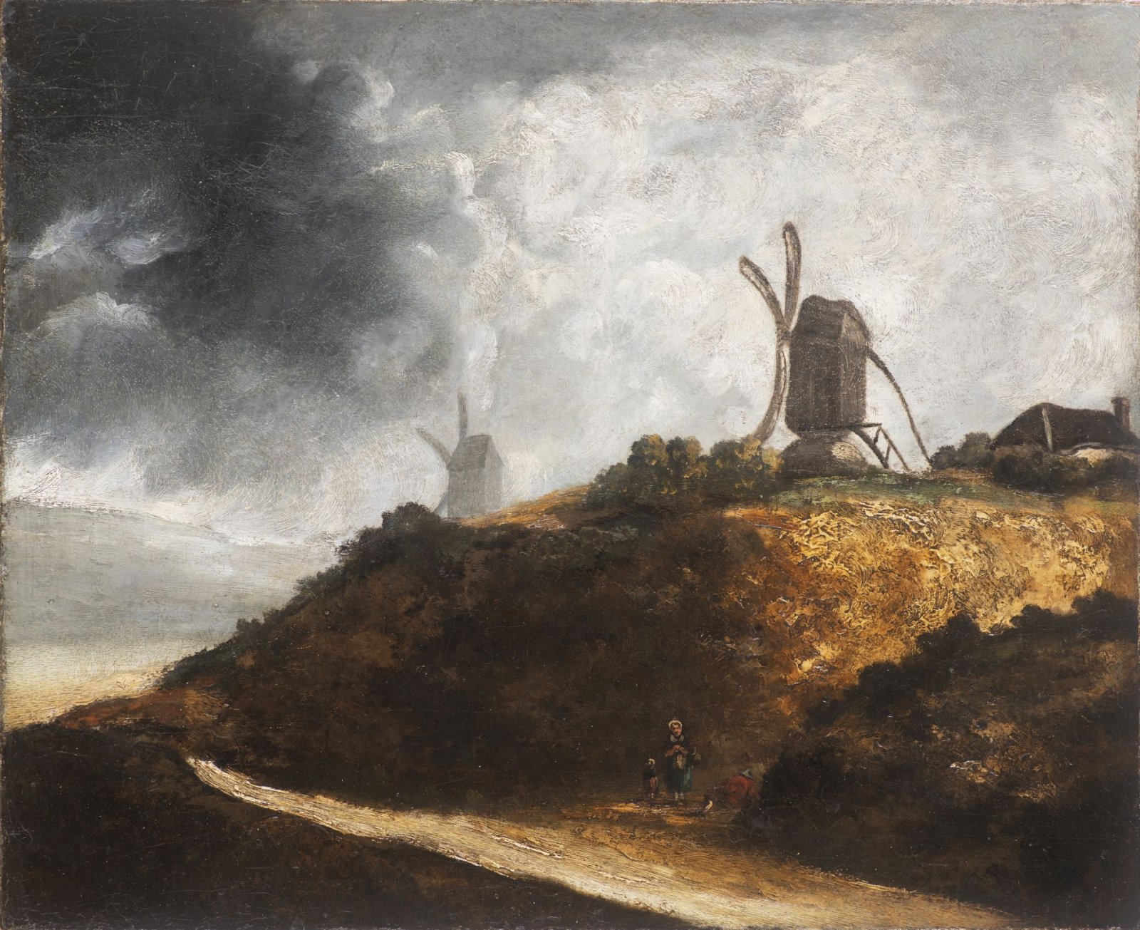 Die Bildkomposition zeigt einen Ausschnitt einer typischen Landschaft aus der Umgebung von Paris mit eindrucksvoller Himmelatmosphäre. In der Bildmitte sind auf dem Weg drei Gestalten zu sehen, und hinter ihnen am Horizont ragen Windmühlen und ein Häuschen in die Höhe. Im Hintergrund des Bildes lässt sich eine Wasserfläche erahnen. Der bedeutende Vorgänger der Schule von Barizon, einer Gruppe französischer Landschaftsmaler, Georges Michel, war zu Lebzeiten praktisch unbekannt. Er wurde in Paris geboren und sein erster Lehrer war der auf historische Gemälde spezialisierte Prof. Leducs. Später studierte Michel Nicolas Antoin Taunay. Erstellte zwar auf dem Salon de Paris aus, erlangte jedoch zu Lebzeiten keine besondere Anerkennung und verdiente seinen Lebensunterhalt als auf niederländischer Malerei spezialisierter Kopist und Restaurator. Die meisten seiner Arbeiten beschäftigen sich mit der ländlichen Landschaft rund um Paris. Er wurde von niederländischen Malern wie Jacob van Ruisdael und Meindert Hobbema beeinflusst. Nach seinem Tod geriet für ein Jahrzehnt in Vergessenheit. Erst 1927 gab es die erste große Ausstellung seiner Werke. Heute finden sich seine Werke weltweit in allen wichtigen Museen, etwa dem Metropolitan Museum of Art, dem Portland Museum of Art, der Vanderbilt University Gallery, dem Straßburger Musée des Beaux-Arts, dem Victoria and Albert Museum und vielen weiteren.