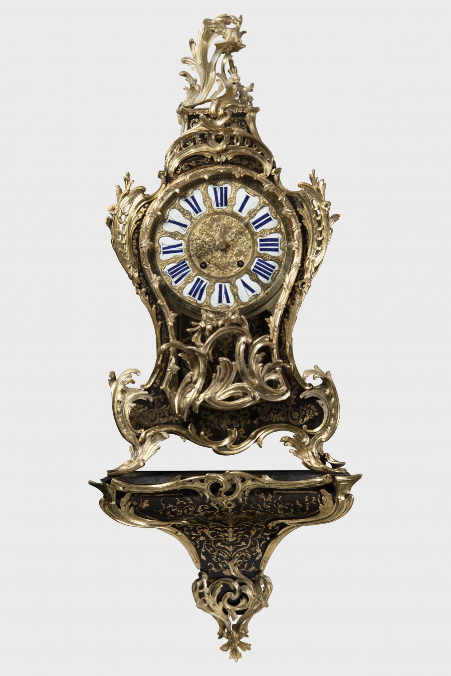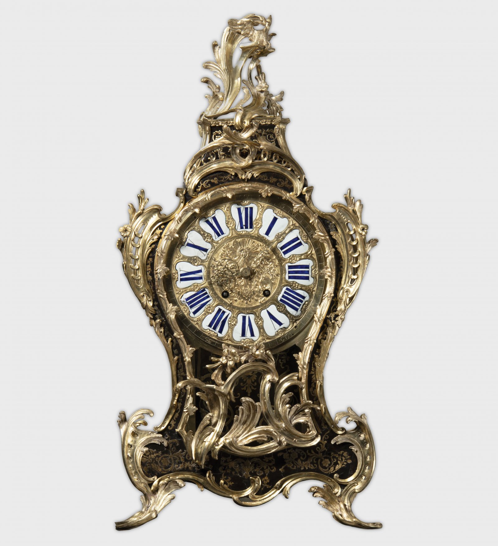 An imposing cartel clock from the reign of Napoleon III in the style of Louis XV, with a rich decoration of materials consisting of brass and tortoiseshell made in the boulle technique combined with dynamic massive chased fire-gilt bronzes with floral morphology, topped with a bird scene on the top and polished brass on the sides. The gilt dial bears the likeness of King Louis XV and has enamel insets with blue coloured Roman numerals. This is an exceptionally representative example of the craftsmanship excellence of French bronzers with their designs for interior furnishings. Clock case completely restored, machine to be adjusted by a watchmaker.