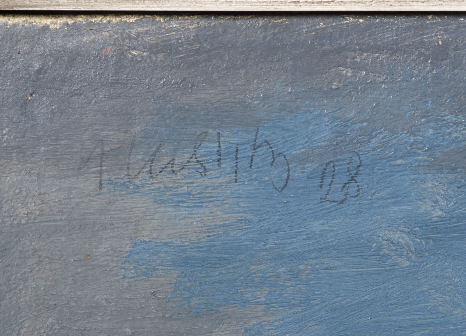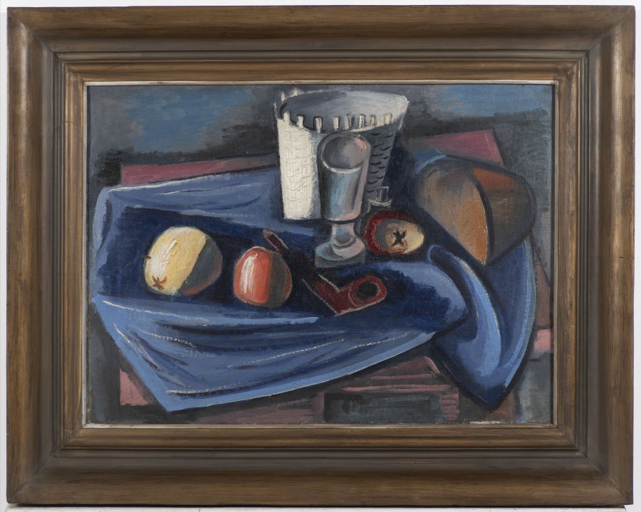 From the expert opinion of Rea Michalová, PhD, as part of Trinity Art Research: 'Alfred Justitz, a gentle observer of life, things and nature, a quiet thinker with a kind of predestined fascination with the magic of Old Testament stories, is today recognised as one of the most artistically and humanly pure representatives of the founding generation of Czech modern art. The present painting "Still Life with Apples, Bread and Pipe" can be described as a work of painterly sovereignty that bears the hallmarks of Justitz's painterly expression of the second half of the 1920s. At that time, the artist stood at the beginning of his creative peak, armed with talent, experience and immeasurable will. Numerous analogies can be found both in the subjects, with which the artist repeatedly manipulated in pictorial terms, and in the painterly treatment of the present work and other works from this period - be it structural scraping or linear contours, which bring an extraordinary optical richness and freshness to the work. The back side bears a label from the Gallery of Fine Arts Olomouc with the inventory number O-1044 on the blindframe. The painting was kept as a confiscate until 1992, when it was removed from the MUO collection in accordance with legal regulations. The handwritten inscription "Grmela" undoubtedly refers to the original owner of the work. PhDr. Jan Grmela was a librarian, prose writer, poet, translator from German and director of the Municipal Library in Prague from 1942 to 1945. During his era, the library was hiding books that were forcibly removed from the collection, of which he was probably aware. After the end of the fighting in 1945, he was brought before the Revolutionary Court. He collected sculptures and paintings, and his collection included works by Špála, Filly and Šaloun." A detailed expert restoration, art historical and X-ray fluorescence analysis has been carried out on the work.