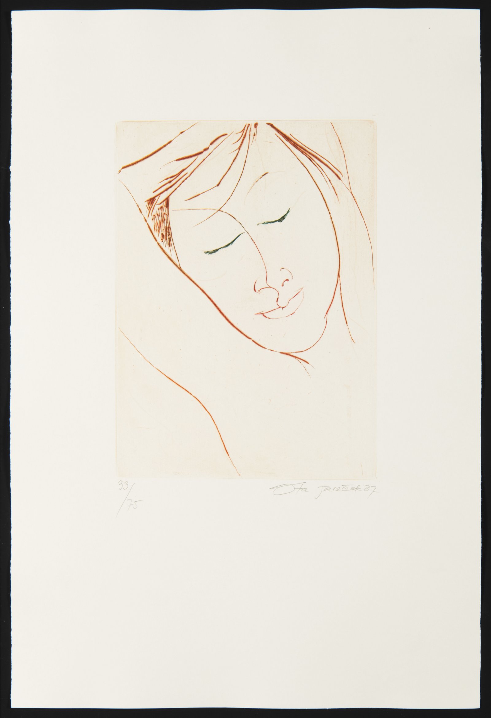 The Head of a Sleeping Woman, executed using the dry-point technique, is the work of Ota Janeček, an important and multi-talented painter whose work was based on both domestic tradition and the legacy of European modernism. From the initial impulses of cubism, lyrical figuralism or French colourism, he turned his attention to his own unmistakable expression. His drawings and prints of female nudes are famous. The dimension given is that of a sheet.