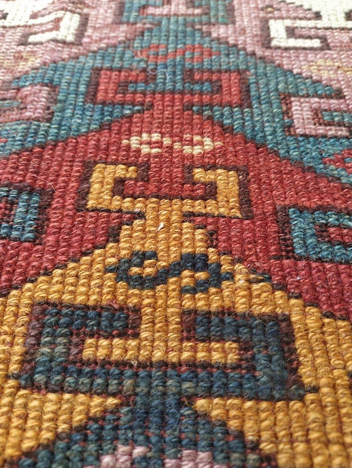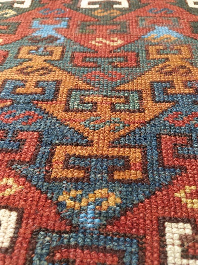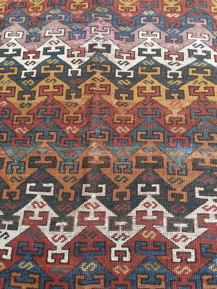 Unique hand knotted wool rug on wool warp, only natural colours. A rare collector's item of the famous yet uncommon ram's horn design and the mysterious hooked S-symbol. Wide border with protective "acrep" (scorpion) symbol. A very similar specimen was published, e.g. in the Kirchheim Collection (see Orient Stars, Kirchheim Collection). North-Eastern Anatolia, Kagizman, 18th-19th century.