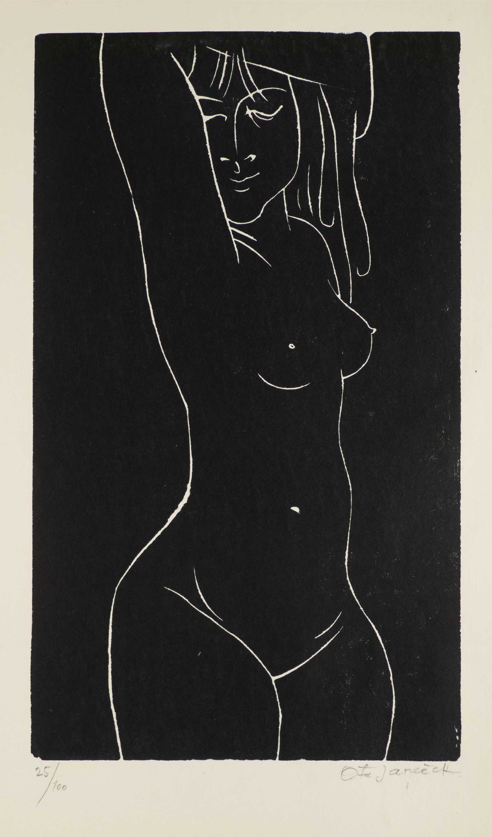 The black linocut of a female nude was made by the talented and versatile painter Ota Janeček, whose work was based on both domestic tradition and the legacy of European modernism. From the initial impulses of cubism, lyrical figuralism or French colourism, he turned his attention to his own unmistakable expression. His drawings and prints of female nudes are famous. The dimension given is that of a sheet.