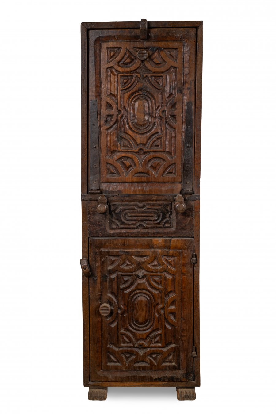An exceptional Renaissance cabinet with rich geometric carving with a drop top carrying a pull-out bracket and a door below. Very good state of preservation.