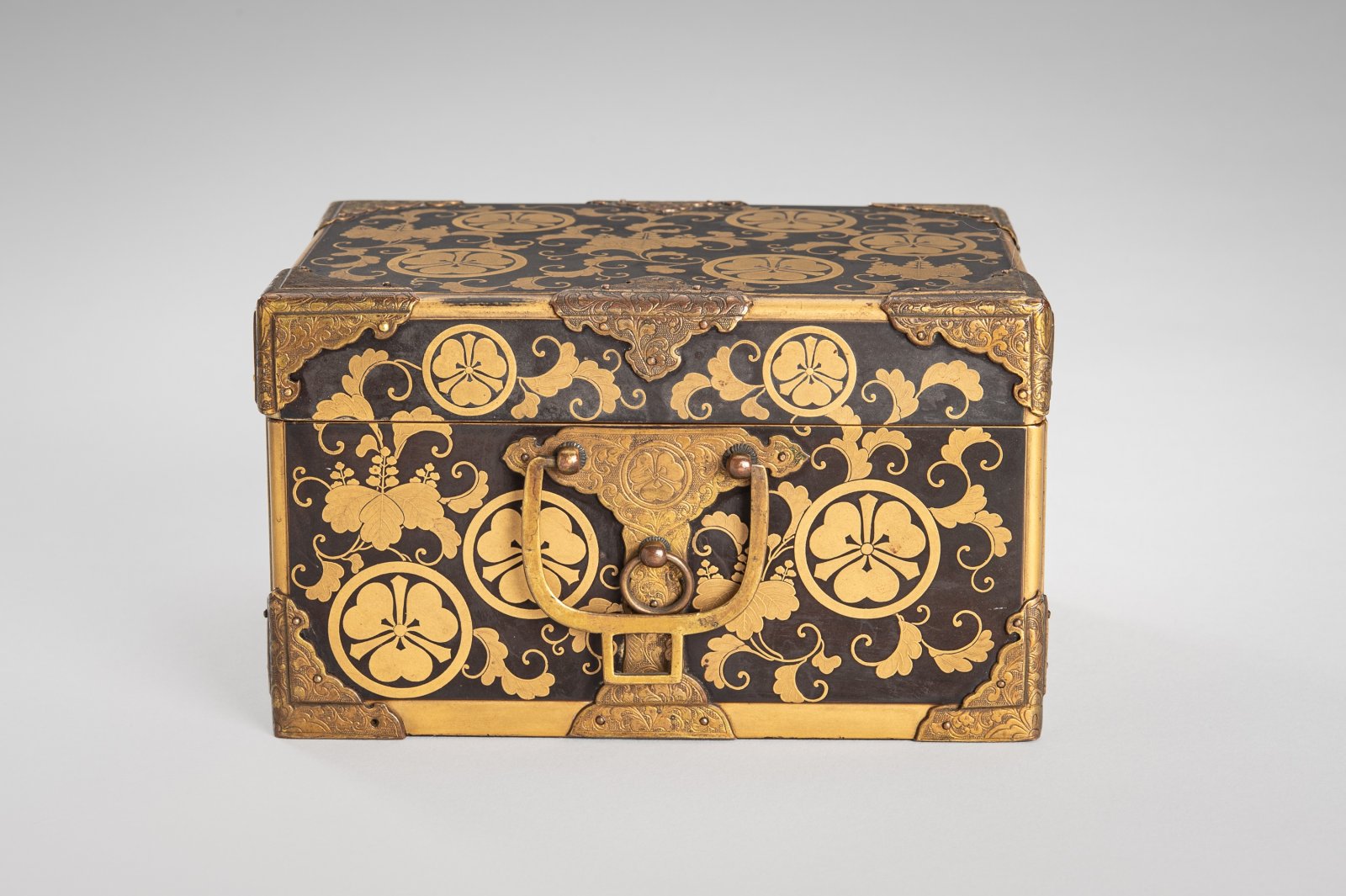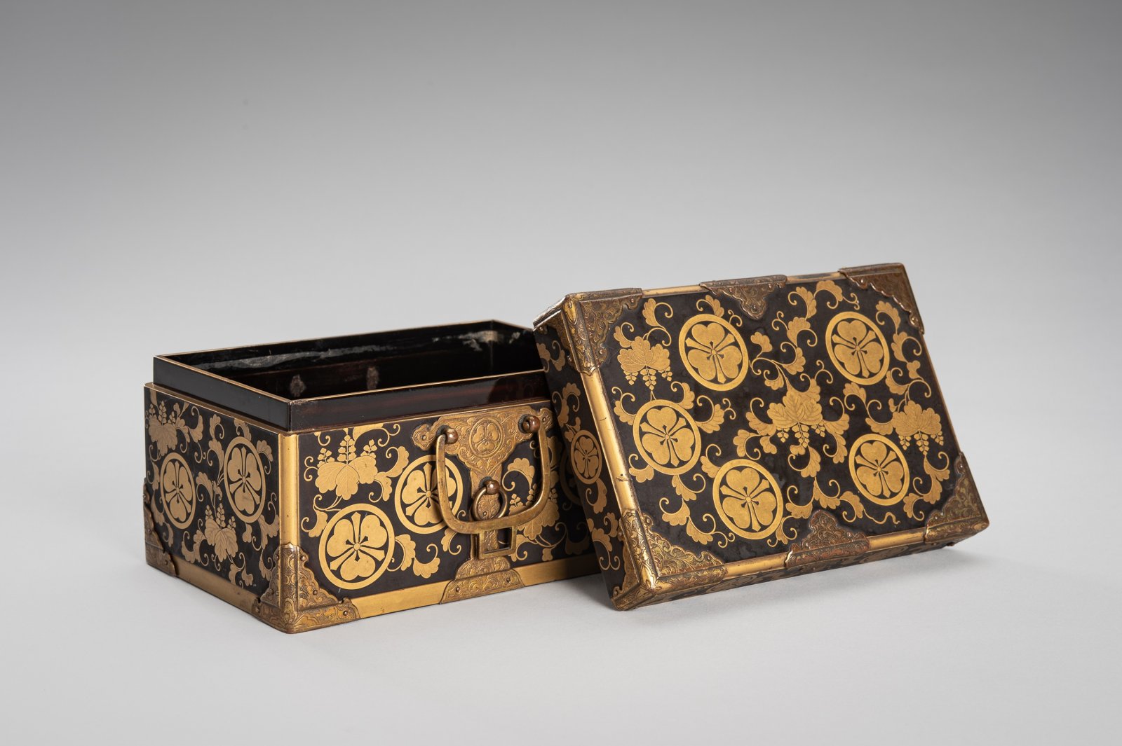 Japan, Edo period, circa 1800-1850. A very luxurious and high-quality lacquered wooden box, decorated using the maki-e technique (gold powder on a carefully lacquered base) and set in a very delicate bronze mount. Boxes ("bako") of various shapes and for various purposes have been part of Japanese culture since time immemorial, and many boxes have established names according to their primary use, e.g., suzuribako is used for writing utensils, kobako is usually used for incense or other fragrant essences, rjóshibako for carrying or storing documents, shikišibako for calligraphy paper, etc. Based on the quality of the workmanship and the family crest (mon or kamon, in the case of the presented box, it may be the mon of the Sakai family), it can be concluded that this is a luxurious piece made to order for a wealthy client. The scrolls in the design represent the beloved Japanese paulownia tree ("kiri").