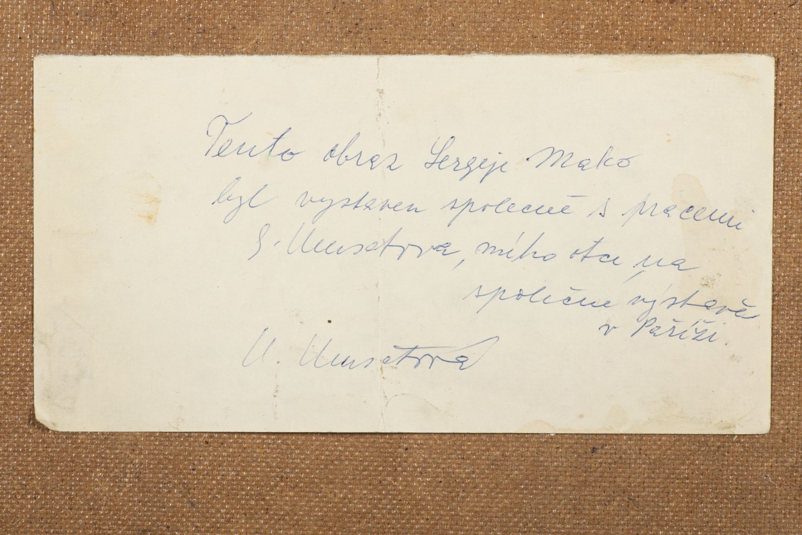 Grigory Musatov, Sergei Mako and dozens of other artists joined the stay in Prague emigration. Sergei Mako addressed both the French landscape and the subject of women - especially portraits and nudes, which he painted under the influence of post-impressionism. The woman at the window presents a quiet and intimate portrait with strongly contrasting color tones and an atmosphere that evokes dreaming or waiting. At the back, an autentification from N. Musatova: "This painting by Sergei Mako was exhibited together with the work of G. Musatov, my father, at a joint exhibition in Paris."