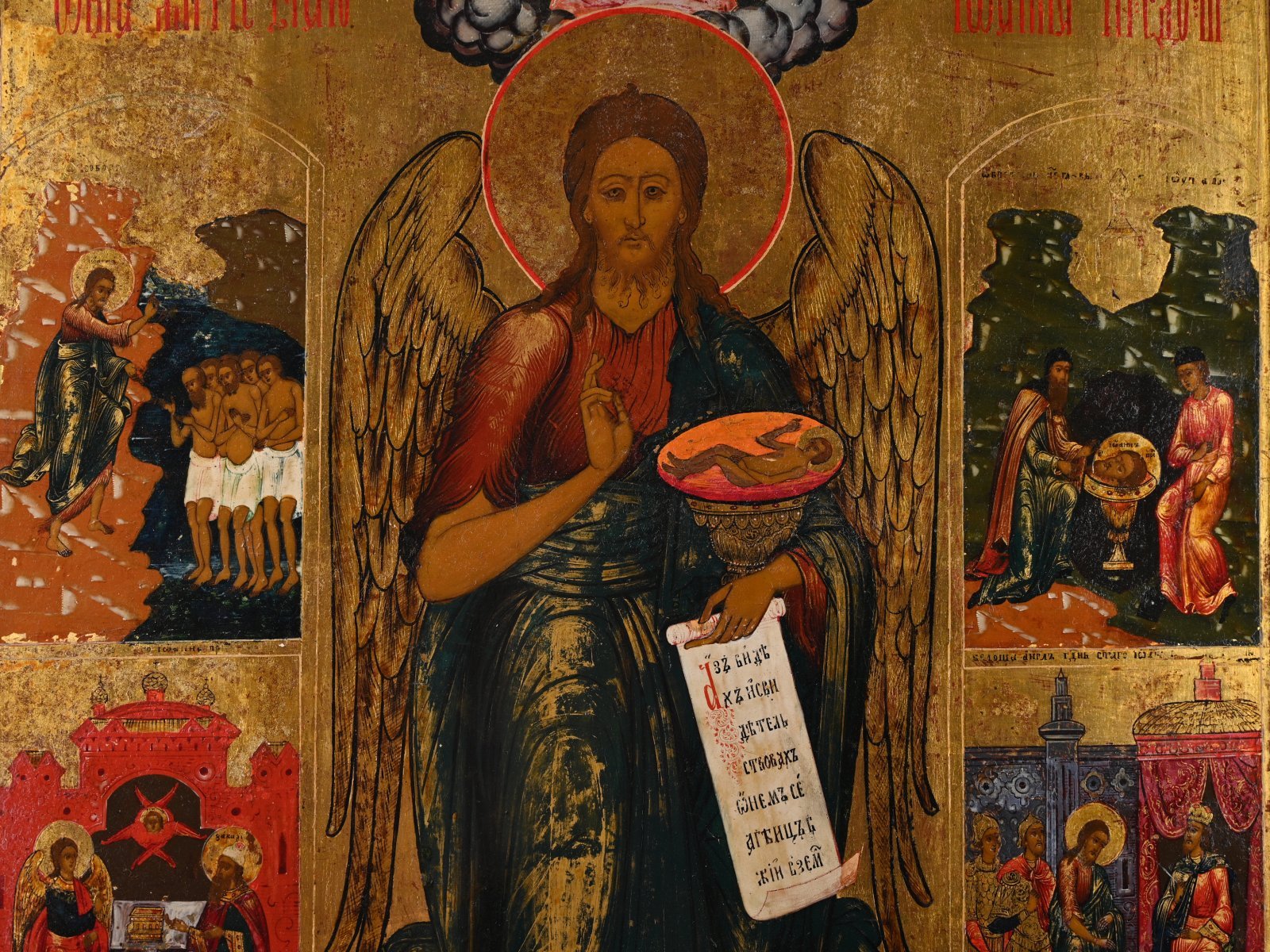 Icon of a winged John the Baptist holding a scroll with an excerpt from Scripture. Scenes from his life are written in the kleimo on his left and right sides.