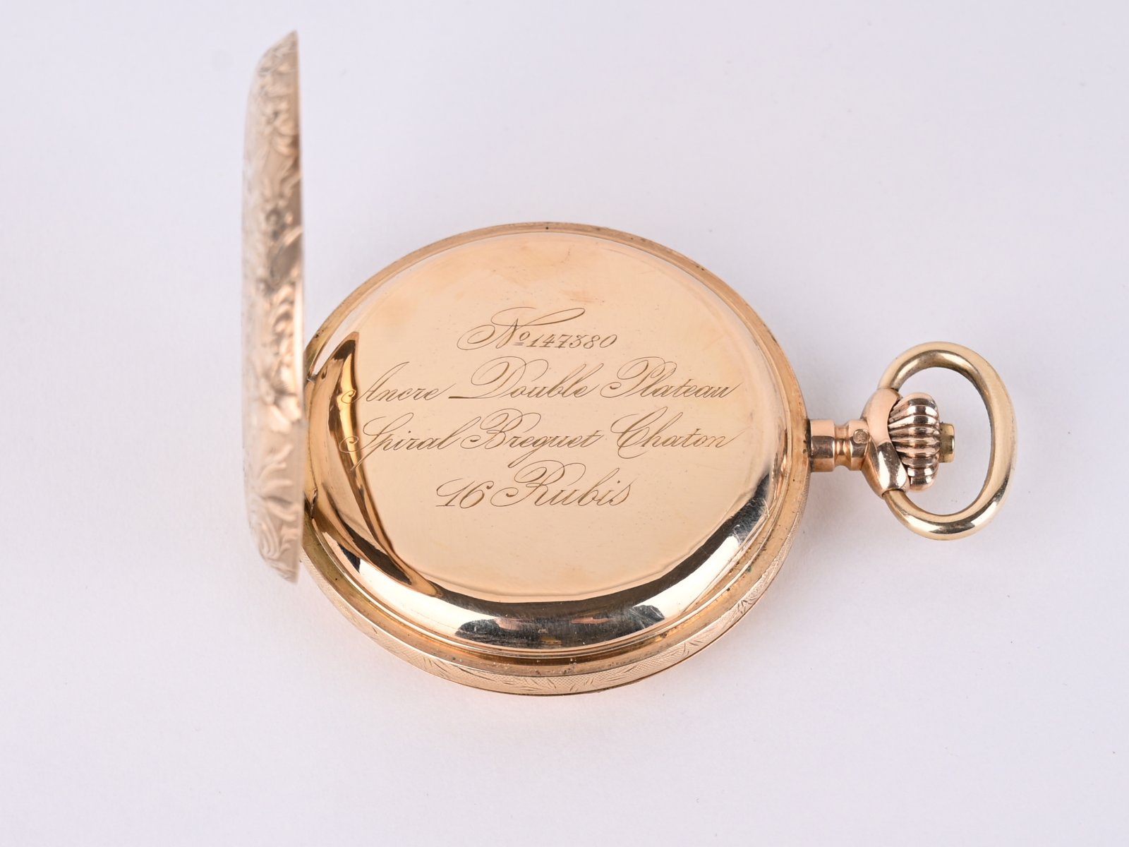 Zlaté kapesní hodinky s bohatou zdobností s arabskými číslicemi a minutovou ručičkou. Značeno vzadu na plášti. Výborný stav.