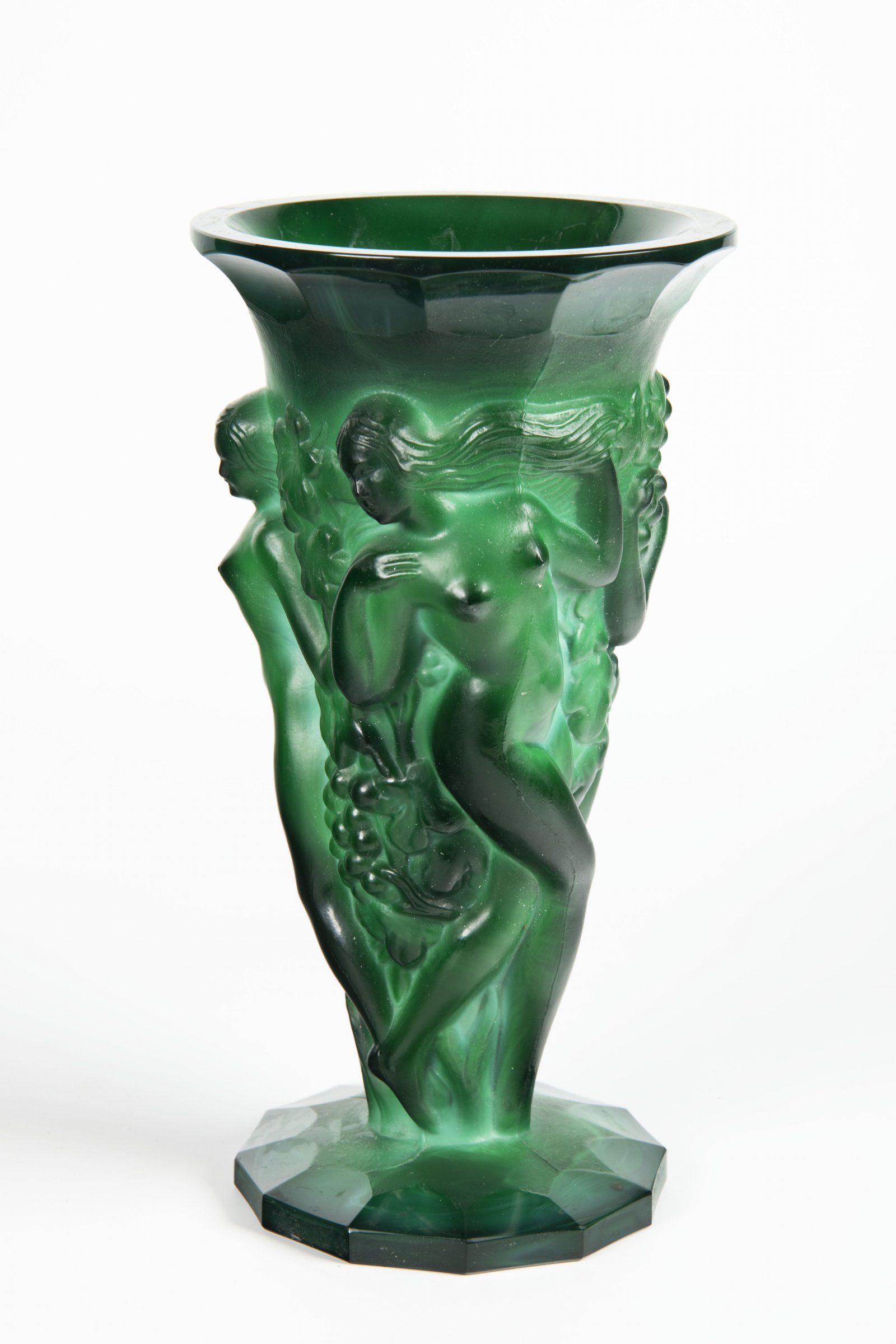 A pair of thematically related vases with a vintage motif, designed by František Pazourek for the Curt Schlevogt glassworks in Jablonec. Modelled in mould with compressed air, matted, polished. Height 13 and 24 cm.