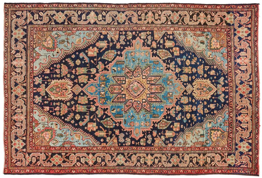 Hand knotted wool carpet on cotton warp. Medallion composition in very attractive colours. Professionally cleaned on both sides.