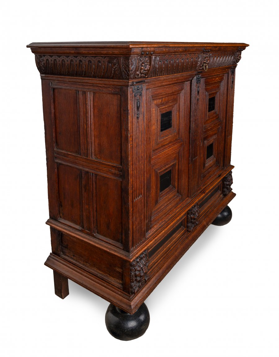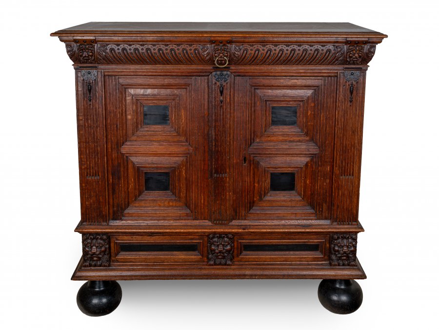 The Renaissance chest of drawers with carved lion heads is made of stained oak wood with carved profiled canelure with black ebony coffered fields, which also decorate the cabinet fronts. A hidden drawer at the level of the solid lion heads is concealed beneath the opening door. Very good state of preservation.