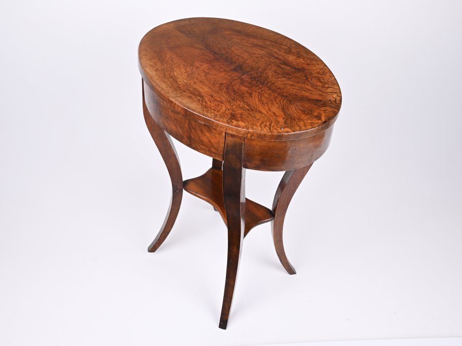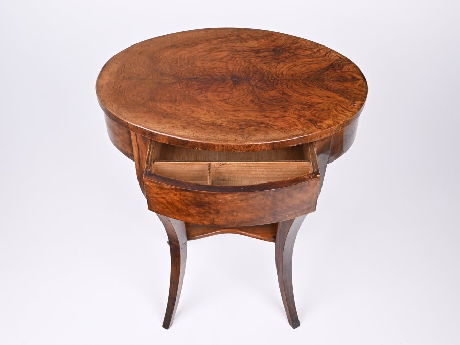 Elegantní stolek z období biedermeieru se skrytým šuplíkem je ukázkou nadčasového designu a bohaté ornamentální kresby dřeva. Bez poškození, k restaurování.