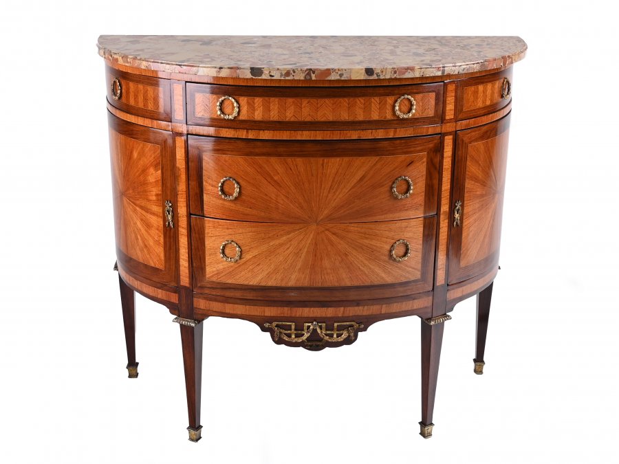 Elegantní komoda se sbíhající kresbou dřeva a intarzií se třemi šuplíky a dvěma otevíracími bočními dvířky s pestře barevnou mramorovou deskou. Restaurováno.