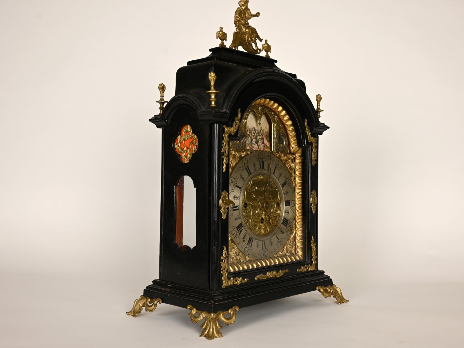 Baroque cabinet clock in an ebony cabinet decorated in fire with gilded brass applications in the Rococo style. In the upper part there is a medallion with a romantic motif. Quarter beating, dial with Roman numerals, mechanism for switching striking and repeating on and off. Made by master clockmaker Andreas Lehmann in Prague, numbered 347.